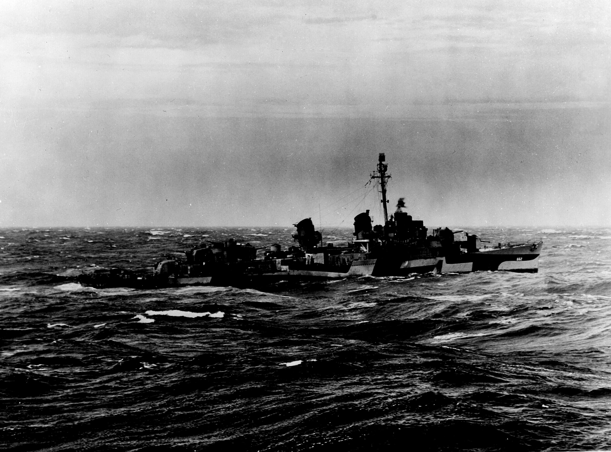 The USS Bennion was first laid down on March 19th, 1943 at the Boston Navy Yard, named after Captain Mervyn S. Bennion, who was killed during the Japanese attack on Pearl Harbor on December 7th, 1941 while commanding the battleship USS West Virginia and posthumously awarded the Medal of Honor. The destroyer, christened by Bennion’s widow, was launched on July 4th, 1943 and, following sea trials, was commissioned into service on December 14th, 1943 with Commander Joshua W. Cooper in command. The USS Bennion was put into service in Destroyer Squadron 56 in Destroyer Division 111.