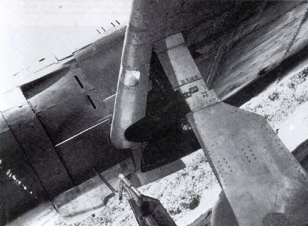 In the foreground, an air-to-air “Ta” bomb, designed for use against large enemy bombers, is suspended under the left wing. However, the 5th Flight Regiment never had the opportunity to use these bombs in actual combat.