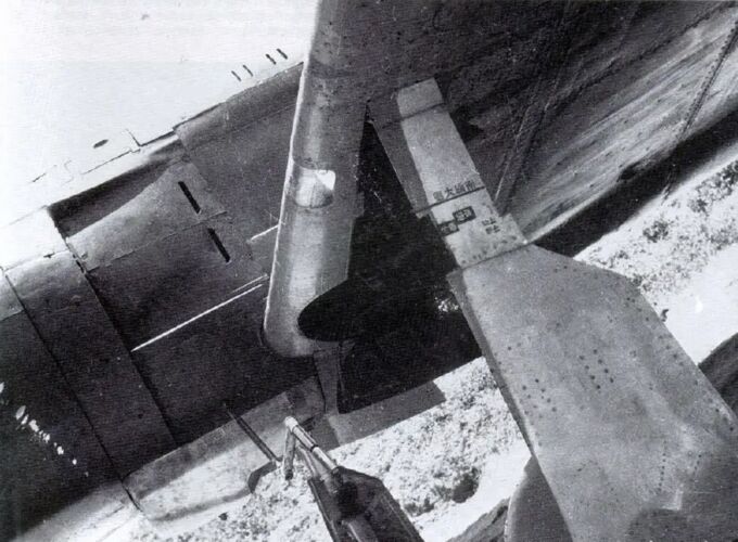 To simplify the production process, the aircraft was delivered with an unpainted duralumin underside, just like the Type 3 Fighter. From this angle, the fairing used to smooth out the fuselage underside—installed after the removal of the radiator system—is clearly visible.