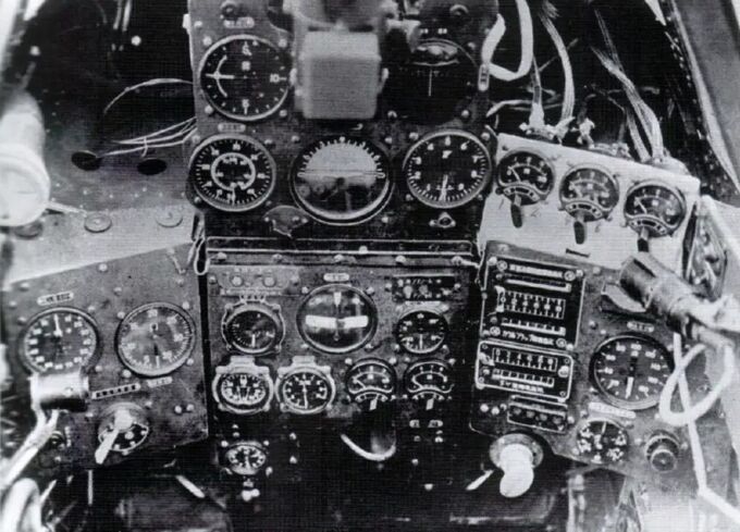 A cockpit view of the Type 5 Fighter prototype (possibly the first unit built) shows an instrument panel layout similar to that of the Type 3 Fighter, though with some differences in the central panel arrangement. Three additional instruments, mounted on the right side panel, were used for performance testing and were not present in production models. The empty spaces at the top left and right of the panel were originally intended for Ho-5 20mm cannons, but they were not installed in this prototype.