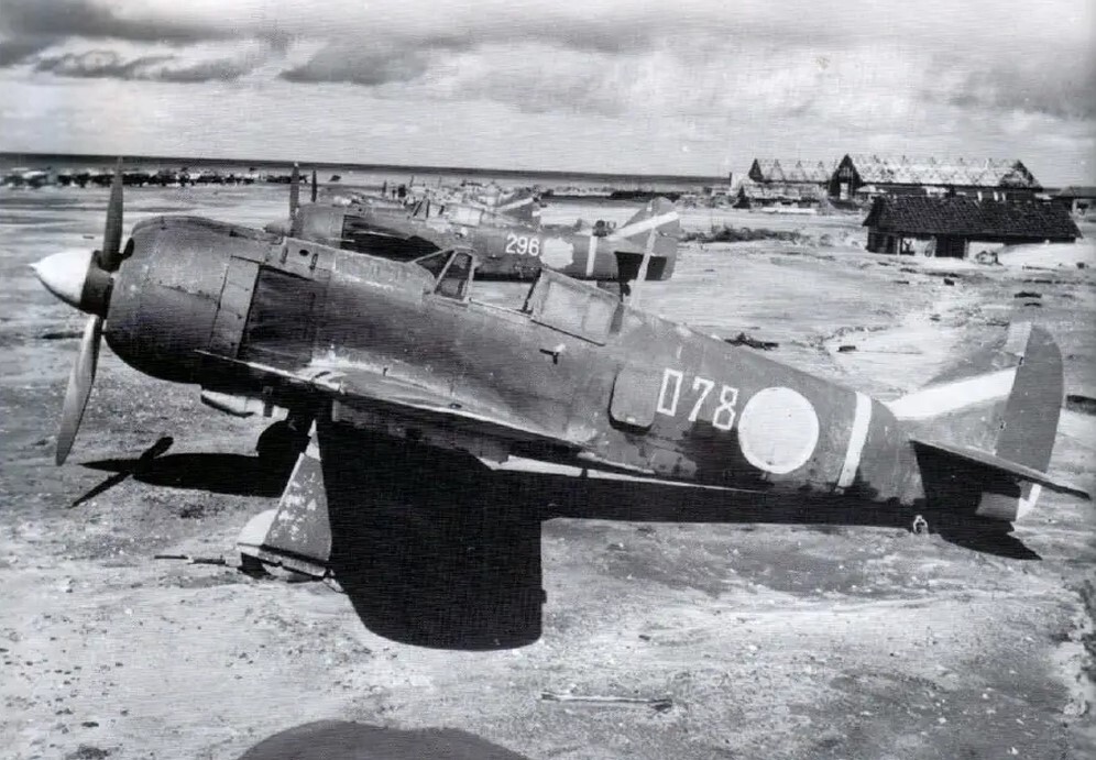 The “078” aircraft, closest in the image, has a replacement rudder (possibly from a Type 3 Fighter), disrupting the squadron markings. One distinguishing feature of the 59th Regiment’s Type 5 Fighters was that the main landing gear covers were painted the same color as the upper fuselage, and aircraft numbers (the last three digits of the serial number) were prominently displayed in white in front of the fuselage Hinomaru (Japanese roundel).