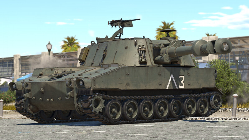Unlike the short, stubby cannons on the earlier variants, the main improvement of the M109A1 was the installation of a new 155 mm M185 cannon, which had a longer barrel and a higher muzzle velocity than the previous M126. Despite the new improvement, the SPG retains a very long reload of 17.28 seconds. Since it's paired with a slow turret traverse rate of 6.5°/s, terrible gun depression of 3°, and a poor gunner zoom magnification of 4.0x, it makes long-range engagements a rather difficult task, but not unachievable. Along with the main gun is a .50cal M2HB heavy machine gun which is helpful for clearing obstacles and shooting down lightly armored vehicles or aircraft.