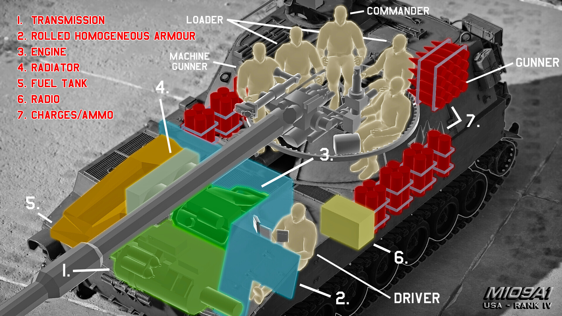 The crew of the M109A1 is slightly spaced out from each other, giving a small bonus towards survivability. On top of that, the large crew count of 6 gives a bonus to crew survivability, easily replacing one crew member should they get knocked out. The driver sits on the engine's left, away from the gunner, commander, and the three loaders. Try not to bring too much ammo, as an M109A1 with full ammo is a powder keg waiting to be detonated.
