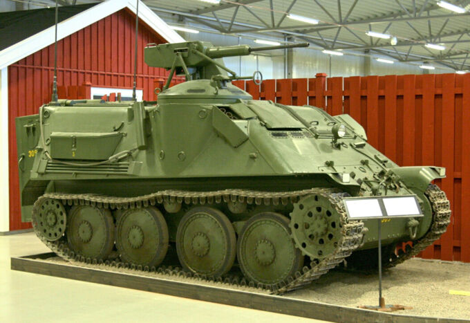 The Pbv 301 (Pansarbandvagn 301 = armored tracked carrier vehicle 301) was an infantry fighting vehicle of the Swedish Army based on the Strv m/41 S-II. It was designed in the 1950s. It was intended to be able to carry a squad of 8 soldiers and provide them with covering fire. The Pbv could do this with the help of a 20 mm Akan m/45B autocannon, but it was also possible to install an 8.4 cm Grg m/48 recoilless anti-tank weapon instead of the auto cannon, or even a 6.5 mm Ksp m/58A machine gun.