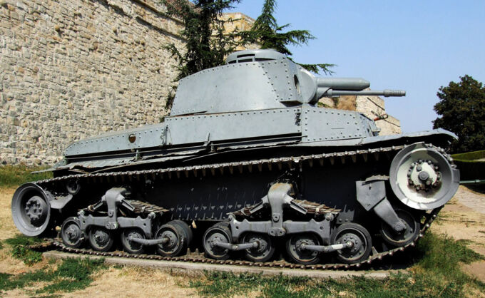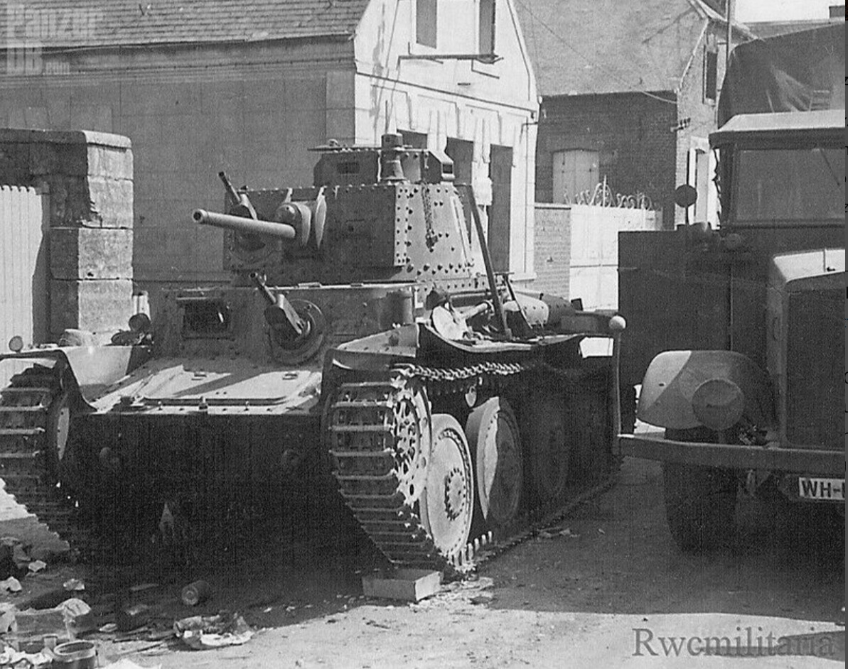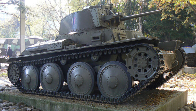 150 LT vz.38 were built by Czechoslovakia. Weighing 9.5 tons, with a crew of four, and riveted armor ranging from 15 mm to 25 mm, it offered good protection for its time. Its 3.7 cm KPÚV vz.34 or vz.38 cannon had a penetration of 30 mm at 500 m, supplemented by two 7.92 mm ZB vz.37 machine guns.
