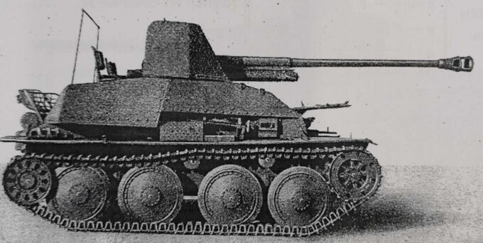 In the first series of the Marder III, initially known as the Panzerjäger 38(t), the 7.62 cm PaK 36 (r), the Soviet 7.62 cm F-22 field gun, which had been captured in large numbers, was mounted on the unchanged hull of the Pz. 38(t). The gun was modified; among other things, the chamber was lengthened to achieve a higher muzzle velocity with the more powerful propellant charge of the PaK 40. Due to its design, the vehicle was very high. The gun crew was positioned above the engine compartment at the rear, where they were only lightly protected and there was no armor protection above or to the rear.