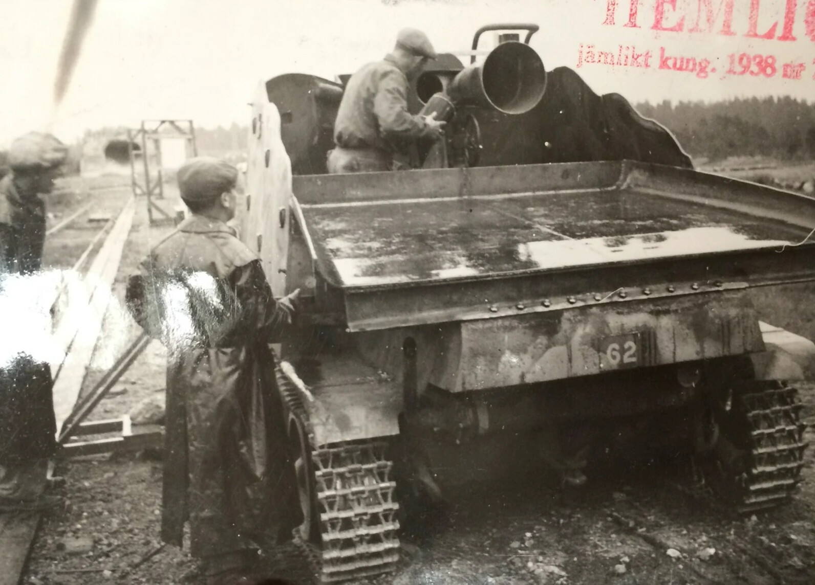 In parallel with the development of the Sav m/43, KAFT, in collaboration with Bofors, continued to test ideas for SPG requirements on the Strv m/38 chassis. By July 1943, the vehicle was again converted, this time with an experimental 15 cm recoilless gun based on the 15 cm Fsthaub m/02 fortress gun. The overloaded and cramped chassis suffered from a low rate of fire and poor mobility. Despite the obvious design drawbacks, serious consideration was given to converting 12 Strv m/38s as a quick and easy alternative to the Sav m/43. During tests with the prototype in 1943, the army chiefs and KAFT representatives realized that they needed to redesign the chassis to make room for the gun, engine, and crew.