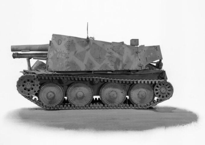 For the final production series, the chassis of the Pz. 38(t) Ausf. M, which had now been specially redesigned for self-propelled guns, was used. The engine was relocated to the center of the hull, and the fighting compartment was moved to the floor at the rear of the hull. This also improved splinter protection for the crew, as the fighting compartment was now enclosed at the rear, although it remained open at the top. The redesigned driver’s front also offered better protection against fire.