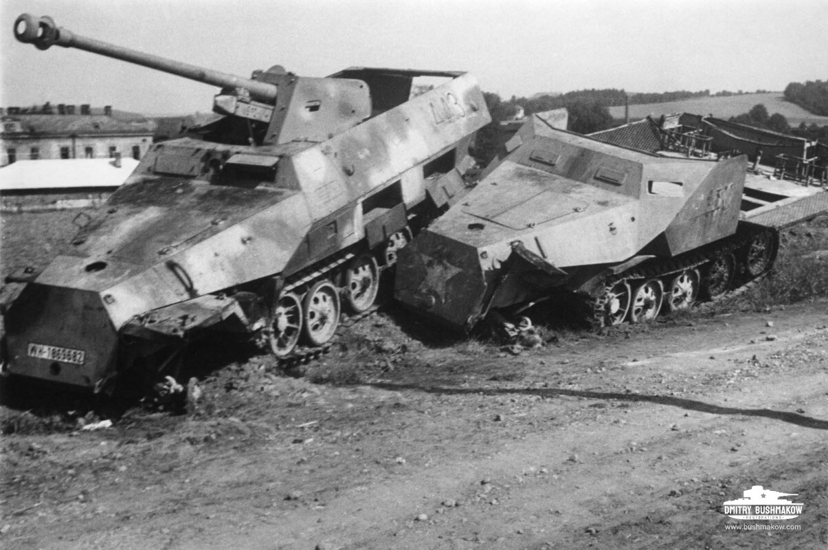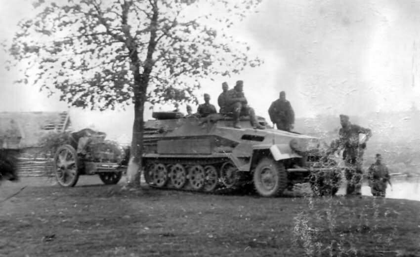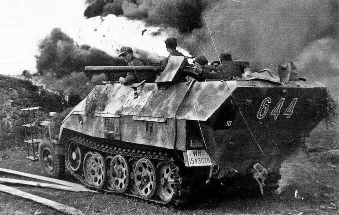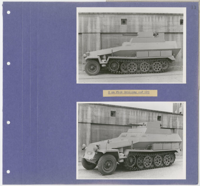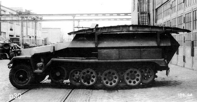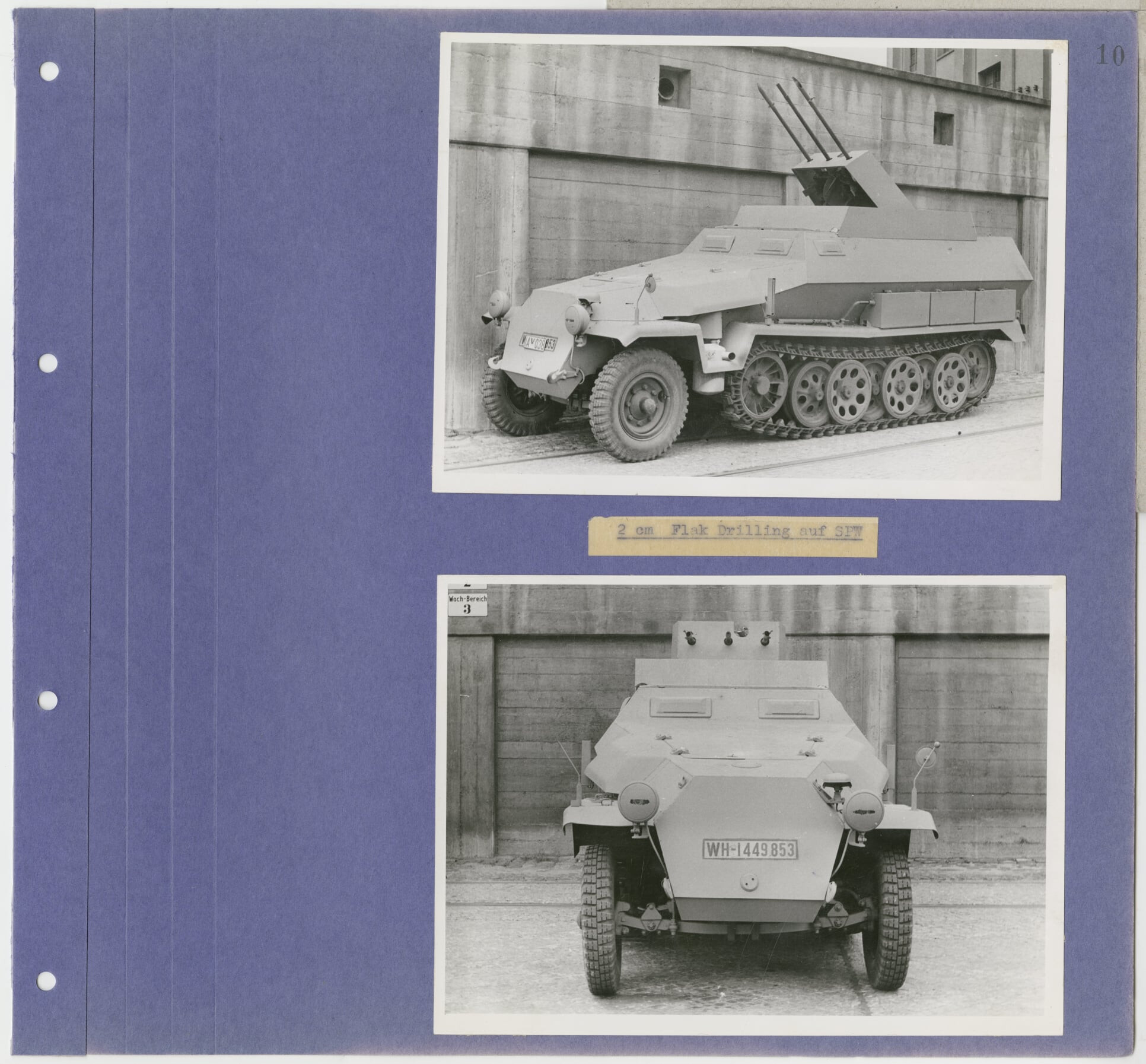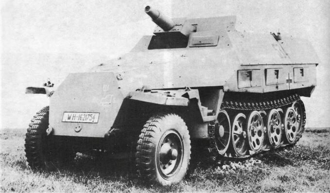 A trial vehicle “Sd.Kfz.251 Ausf.B Teilgepanzert with 7.5 cm Pak 42 L/70. This was a makeshift prototype to the 7.5 cm Pak L/70 in le.F.H. 43 (kp) Oberlafette auf 3 ton Zugmaschine (RH 8/v 311 Folie 3). A planned general-purpose vehicle, together with a 10.5 cm LeFH armed vehicle to extend the base vehicle to the new roles of infantry support and mobile anti-tank gun on an already in production chassis. While neither went into further development nor production, they both showed somewhat good results but were overtaken by the fully tracked Waffenträger vehicles which were universal chassis that could tow or carry guns and ammunition.