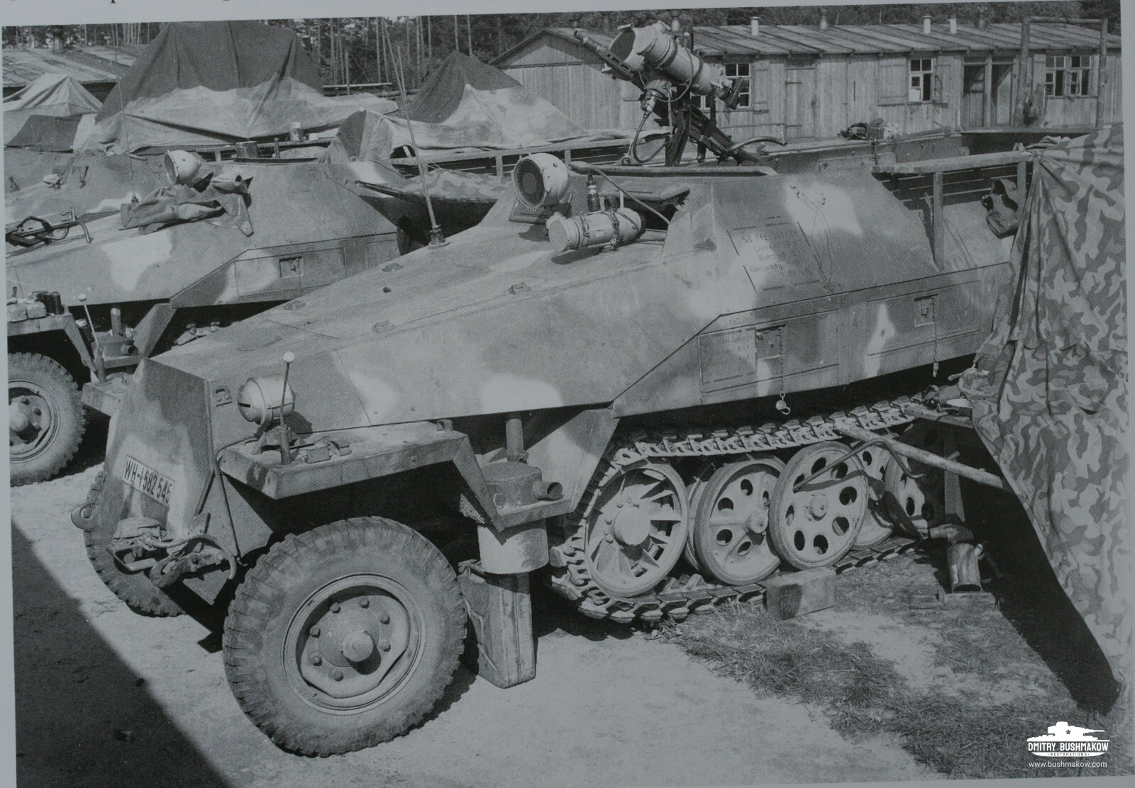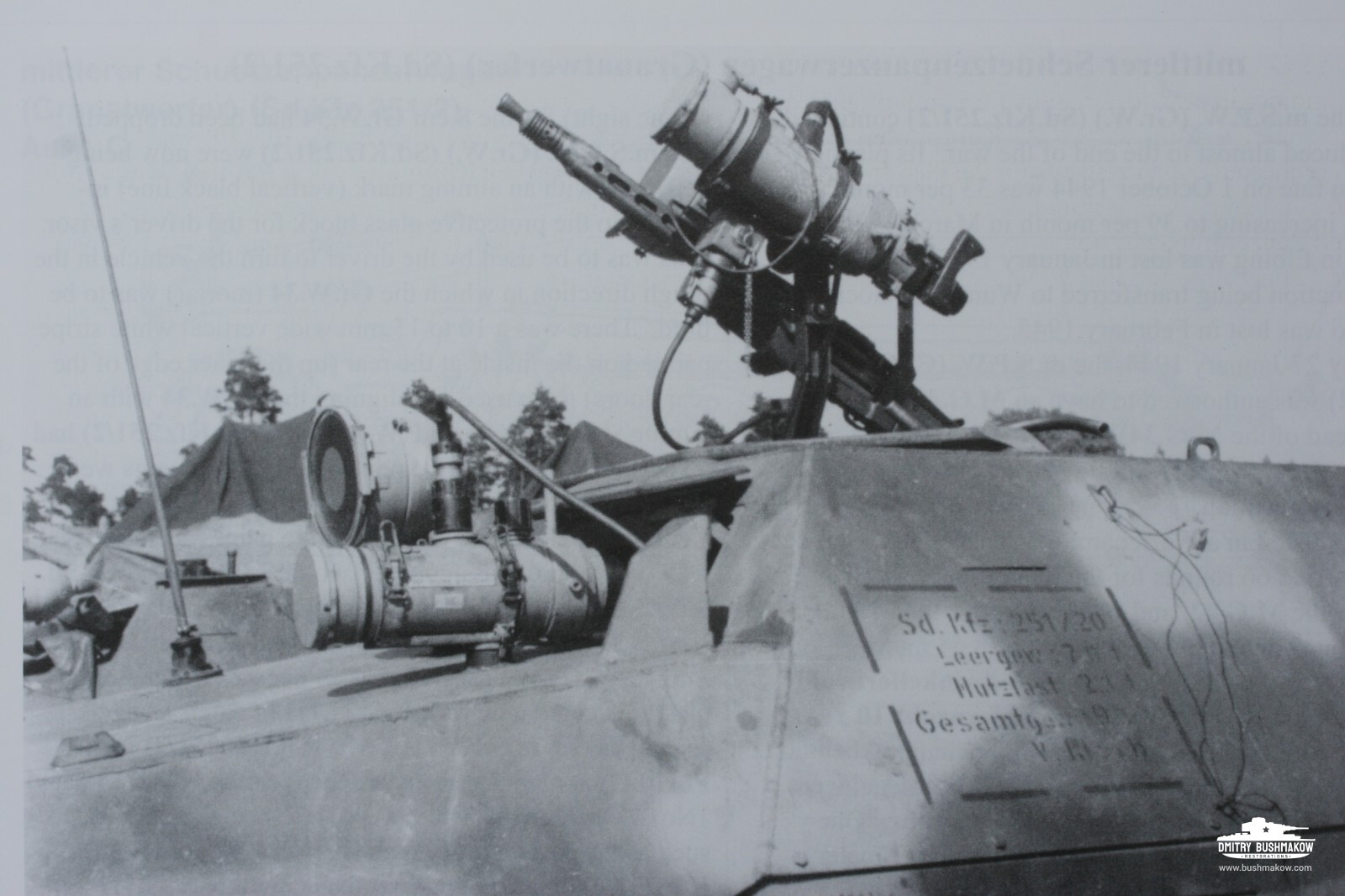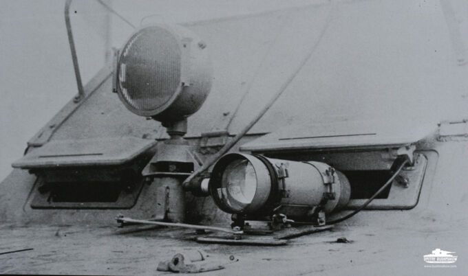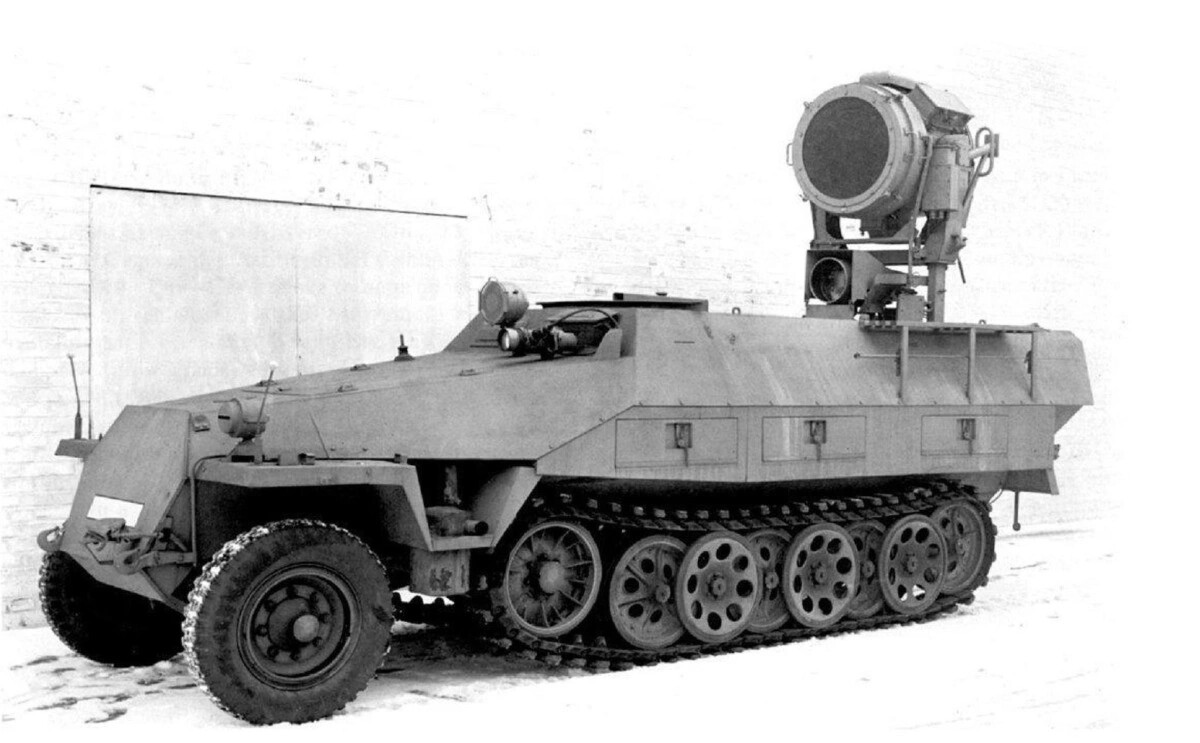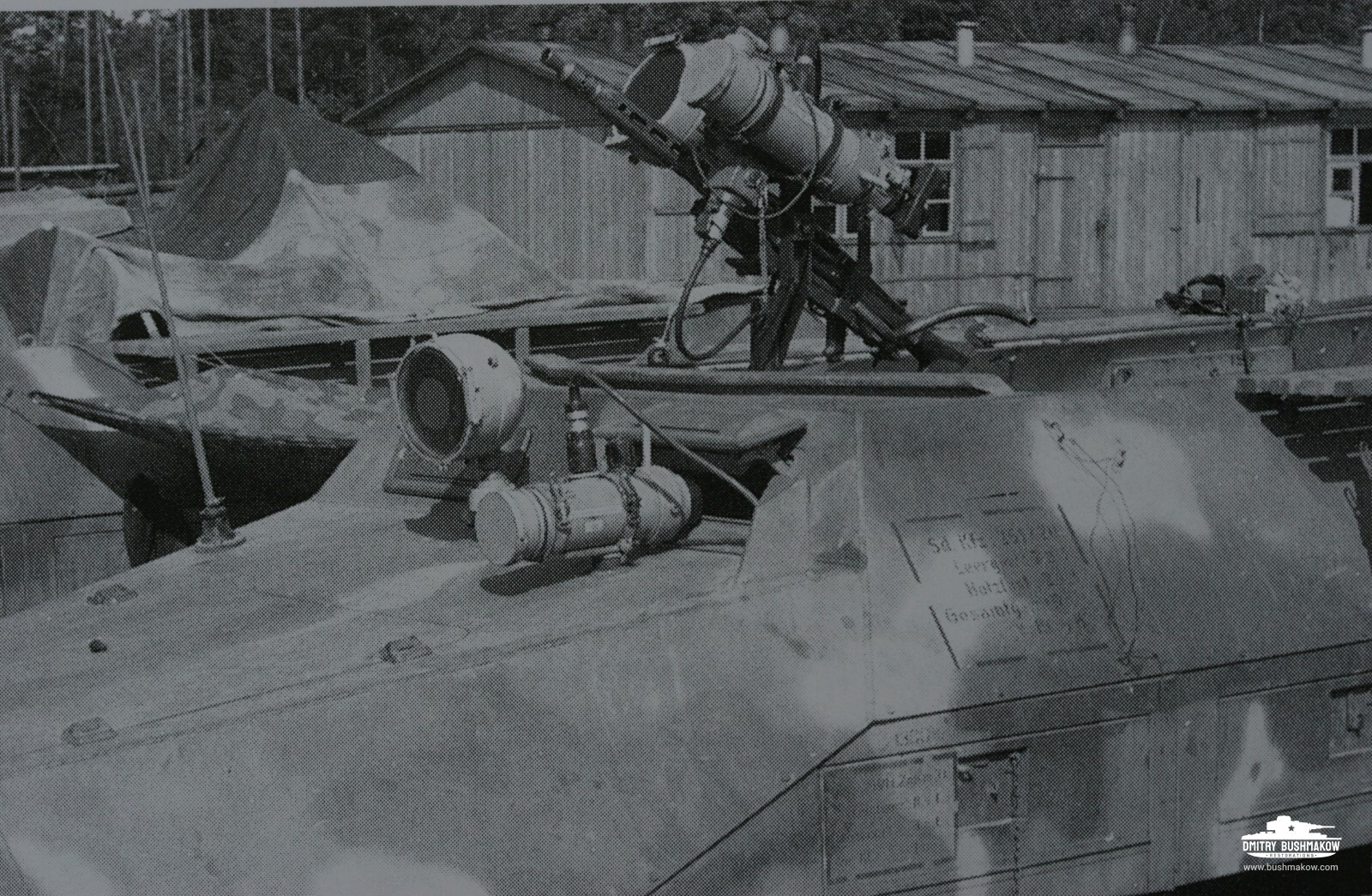 251/20: “Uhu” night equipment with IR 60 cm Infrarotscheinwerfer with 3 km range and 1.2 km effective range. For general field reconnaissance or as main light for vehicles with IR night vision sights such as other Sd.Kfz.251 or Panthers, which own 30 cm IR headlights only had a range of 400m and effective 150m, while the gun range is 2.5 km.