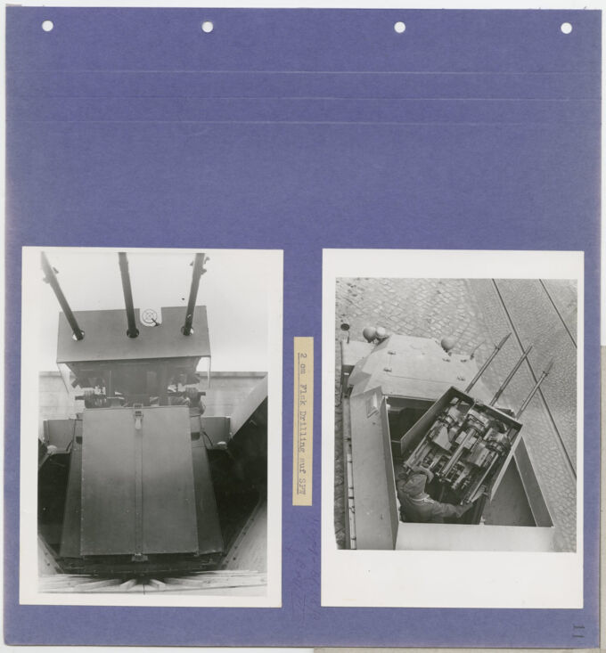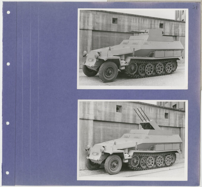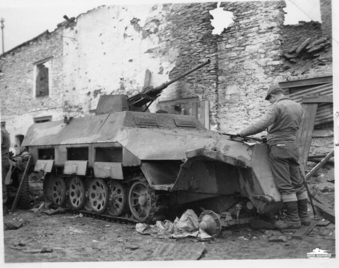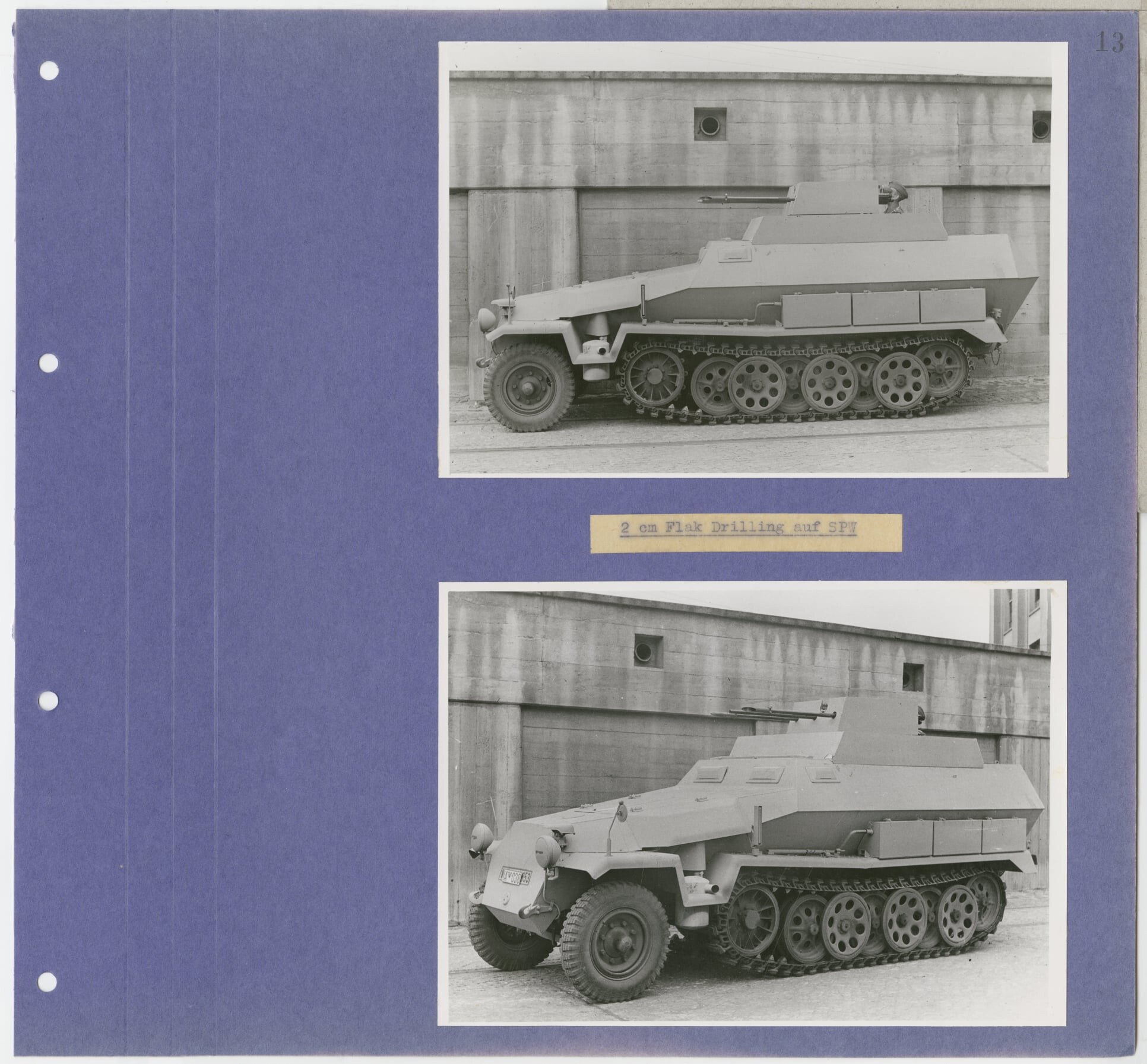 A trial vehicle was armed with a 2 cm C/38 L/65. Usually, the vehicles with the armament had some modifications to them or generally a more complicated/sophisticated mounting; this trial vehicle put a gun directly on the front roof part in a most simple mounting without any protection similarly to the M2 Browning on US half tracks. Results of the trials are unknown. The modification didn’t go into production, however pictures of multiple similar modifications on both 251 and 250 vehicles exist; generally, the 2 cm guns were a well-liked and effective armament.
