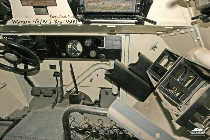 It had a two-piece front plate in front of the engine with a service (and additional cooling) hatch in the lower plate. The Einheitssehklappe (standard vision port) was used from the beginning: two large ones in the front for the driver and co-driver, two small ones on the sides for the driver and co-driver, as well as two per side in the transport compartment. These four vision slits at the back are the main identification for an Ausf. A. The front 14.5mm armor offered immunity to 7.92mm S.m.K. ammo and similar, over range against 12.7mm AP ammo, with all other plates of 8mm thickness and a native angle of at least 30° offering protection against S.m.K. ammo from 30m range. Frontal armament consisted of an MG 34 in either an GP/AA/AI mount or a Schwere MG Lafette; sometimes also a second MG 34 at the back in the GP/AA/AI mount. Per side are three storage boxes fixed to the hull on the fenders, placed in the middle relative to the vehicle.