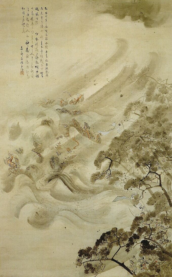 The term "kamikaze" (神風, meaning “divine wind”) originates from the fierce typhoons that repelled the Mongol invasions of mainland Japan in 1274 and 1281.