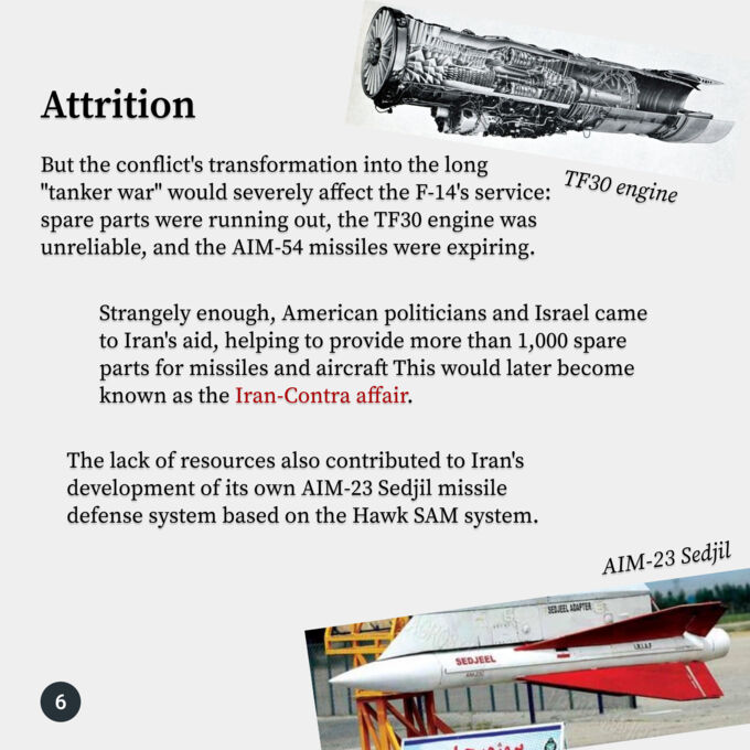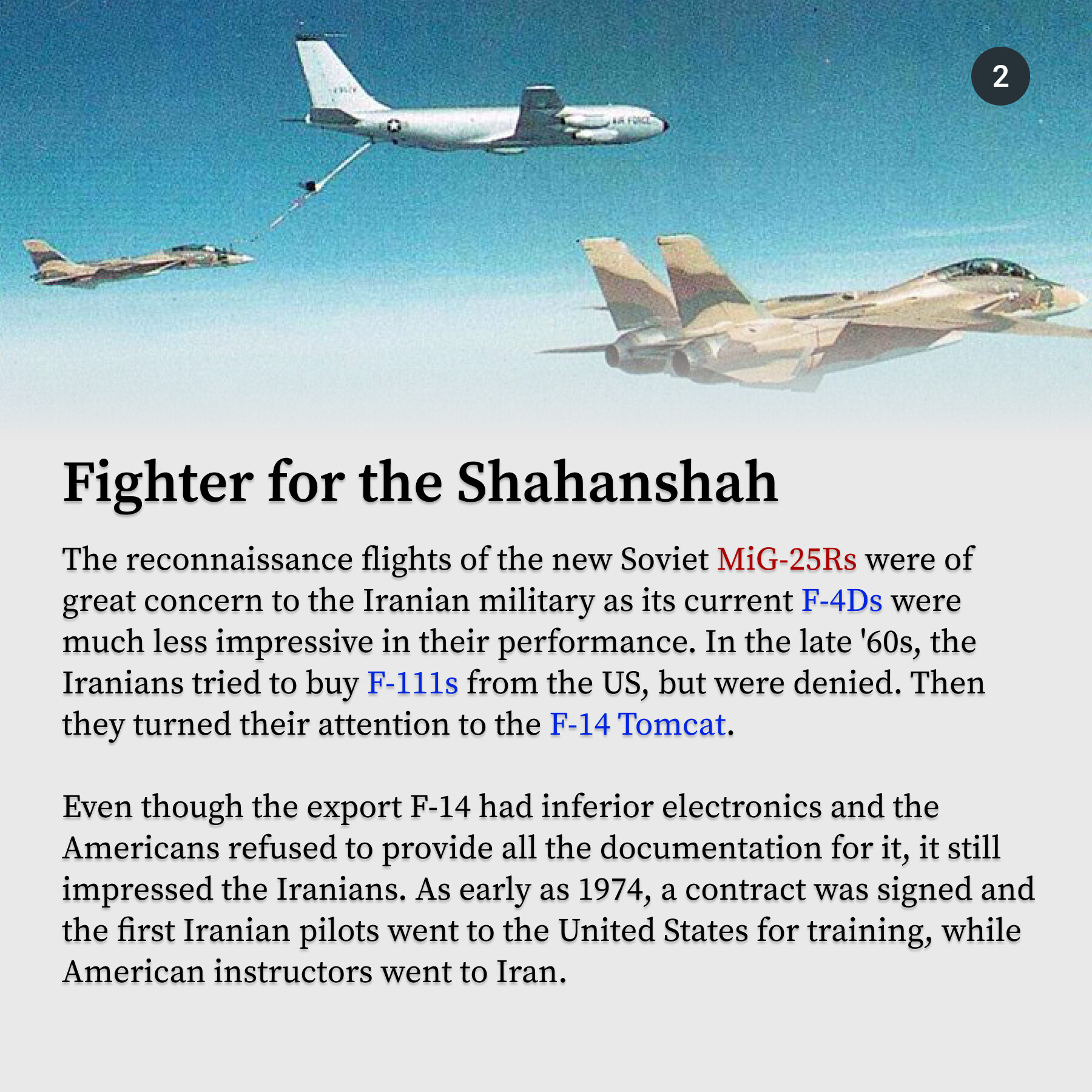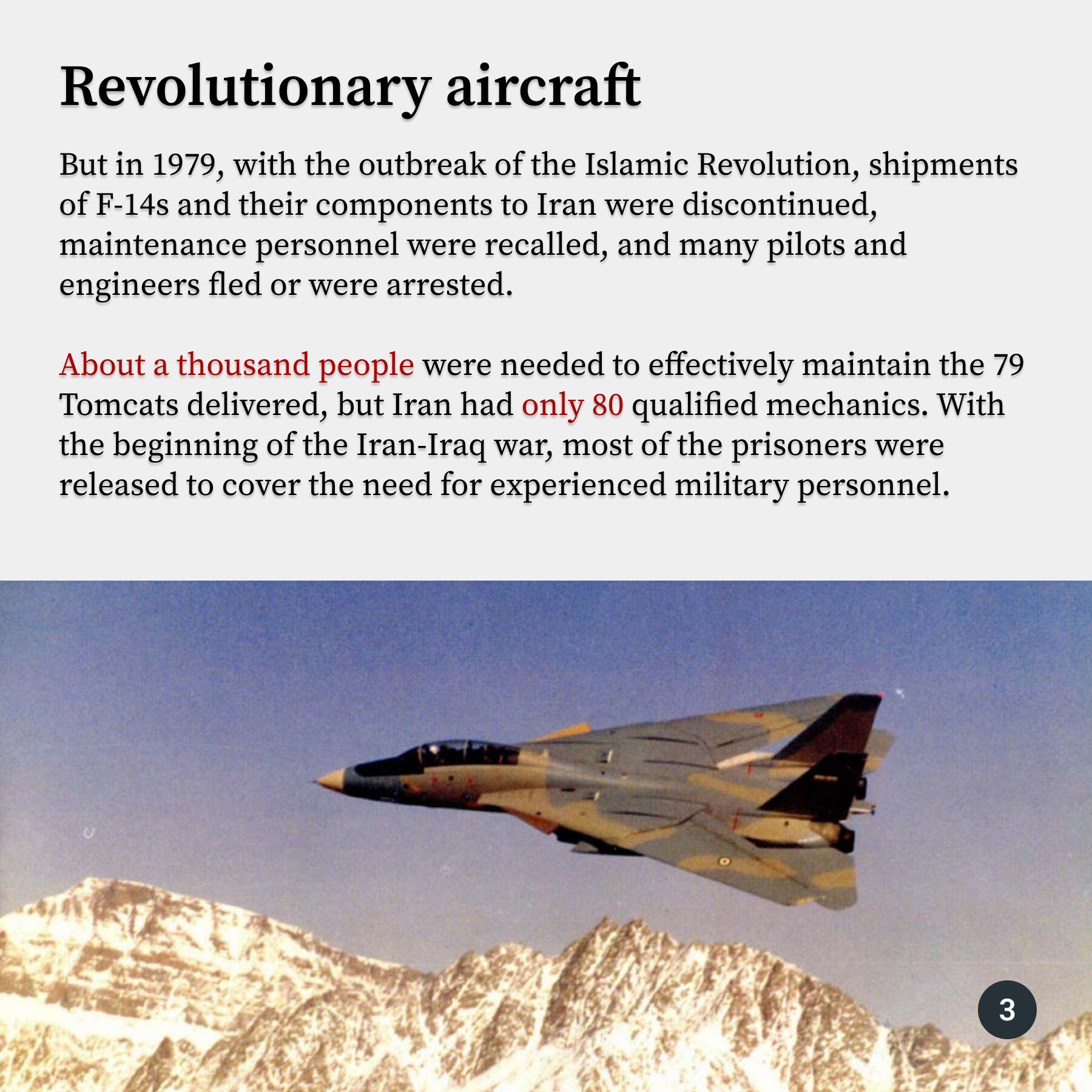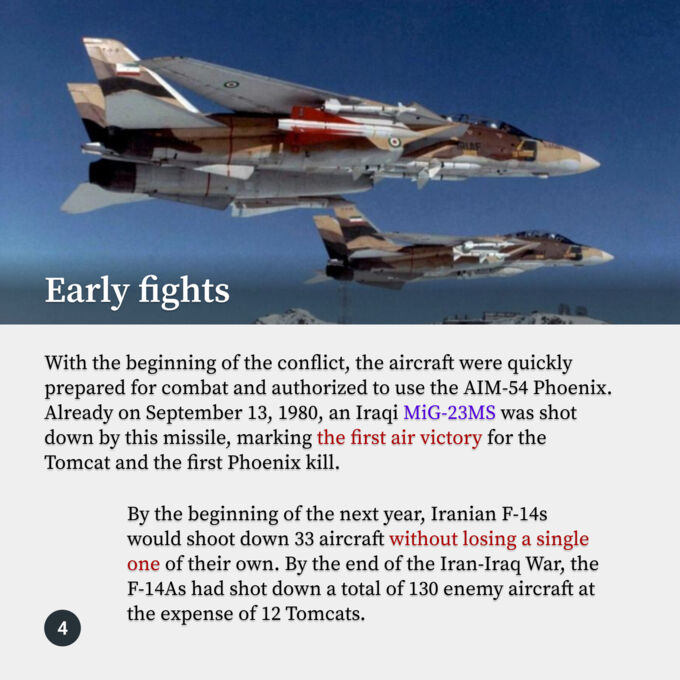 Iran was the only buyer of Tomcats besides the US Navy, but after the Islamic Revolution it severed all ties with the West. But more interestingly, the Iranian F-14As had a more intense and dangerous career than their American counterparts: fighting against a numerically superior enemy and without proper maintenance, they continued to intimidate the enemy and inflict serious damage. After the Iran-Iraq war, the Tomcat's armament package was greatly expanded, and Iran still uses these fighters today. In the game, one of these modified aircraft is represented as the F-14A IRIAF.
