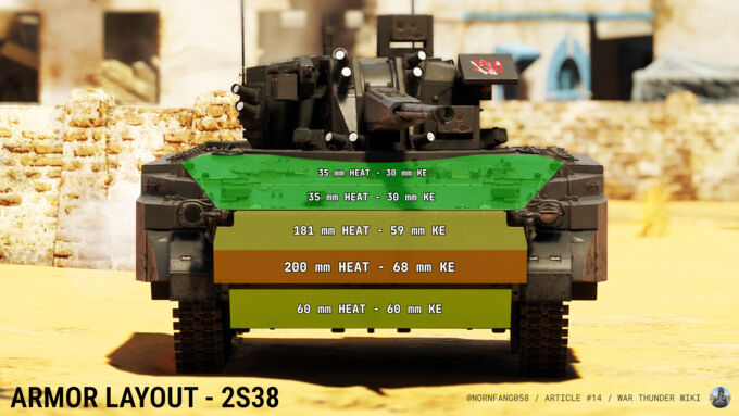 The 2S38 has negligible armor, which offers inadequate protection against most threats. Although the armor can stop light and heavy machine gun fire, autocannons and nearly all HEAT/APFSDS rounds can penetrate the armor with ease. Instead of relying on the armor to stay alive, players should utilize the 2S38's mobility to reposition and evade enemy threats before they are targeted.
