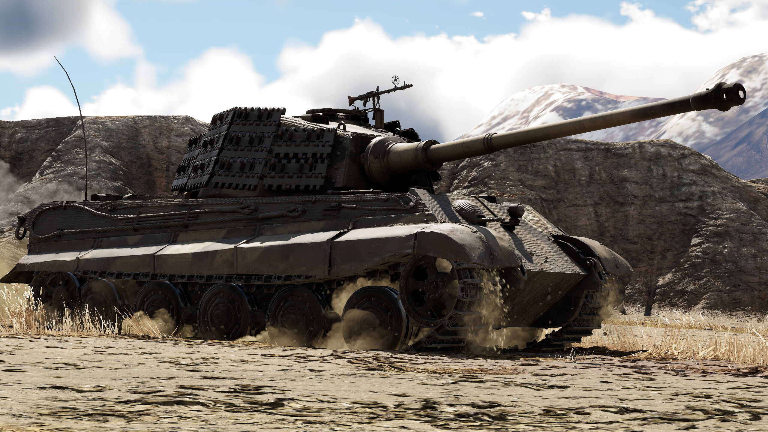 One variant of the Tiger II stands out in the category of mobility — the Tiger II Sla.16. This experimental vehicle comes equipped with a more powerful diesel engine that outputs 680 horsepower, resulting in a power to weight ratio of 9.71 hp/ton — a marked improvement over the standard Tiger II. However, more important is the increase in top speed of 29.2 mph (47 kph) going forwards and 7.0 mph (11.3 kph) in reverse. This means that while the acceleration is still rather poor even with the improved engine, if given enough time to reach top speed the Tiger II Sla.16 can reposition around the map rather swiftly for a vehicle of its weight.
