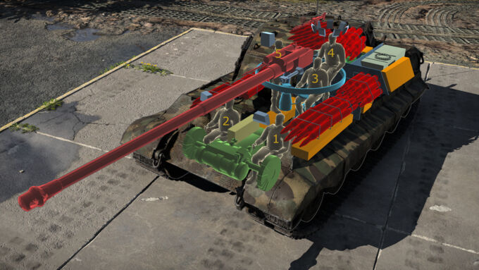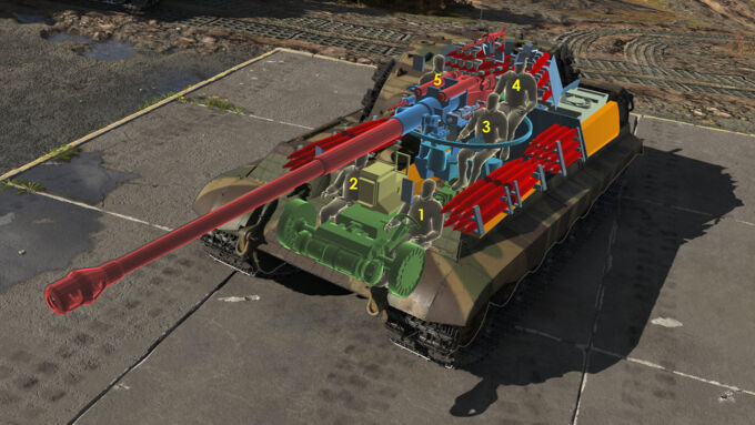 The Tiger II features a five-man crew consisting of a driver (1), machine gunner (2), gunner (3), commander (4), and loader (5). The spacing of these crew members means that at times, a penetrating hit may only incapacitate some of the crew, giving you a chance to retaliate against the enemy.