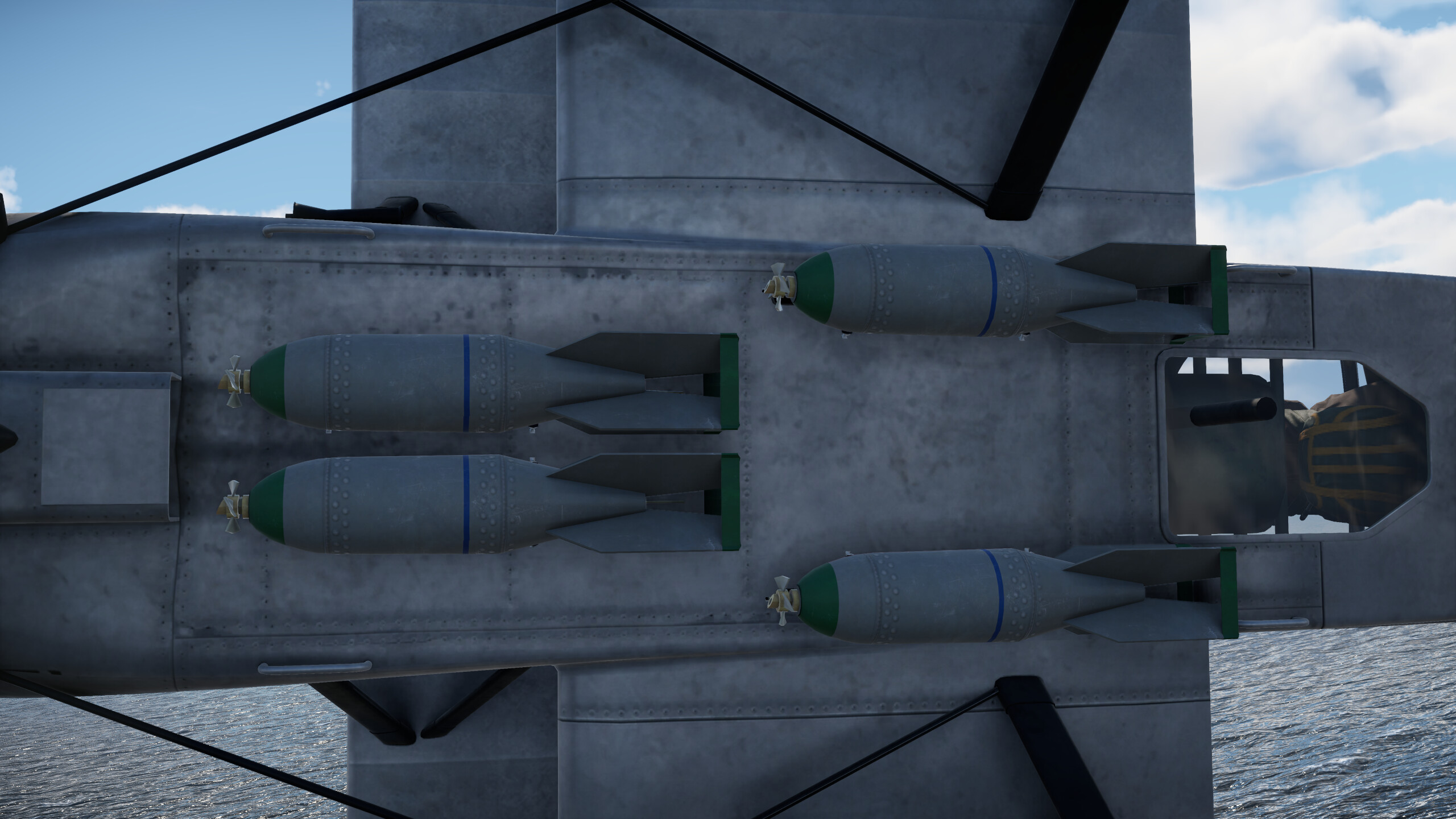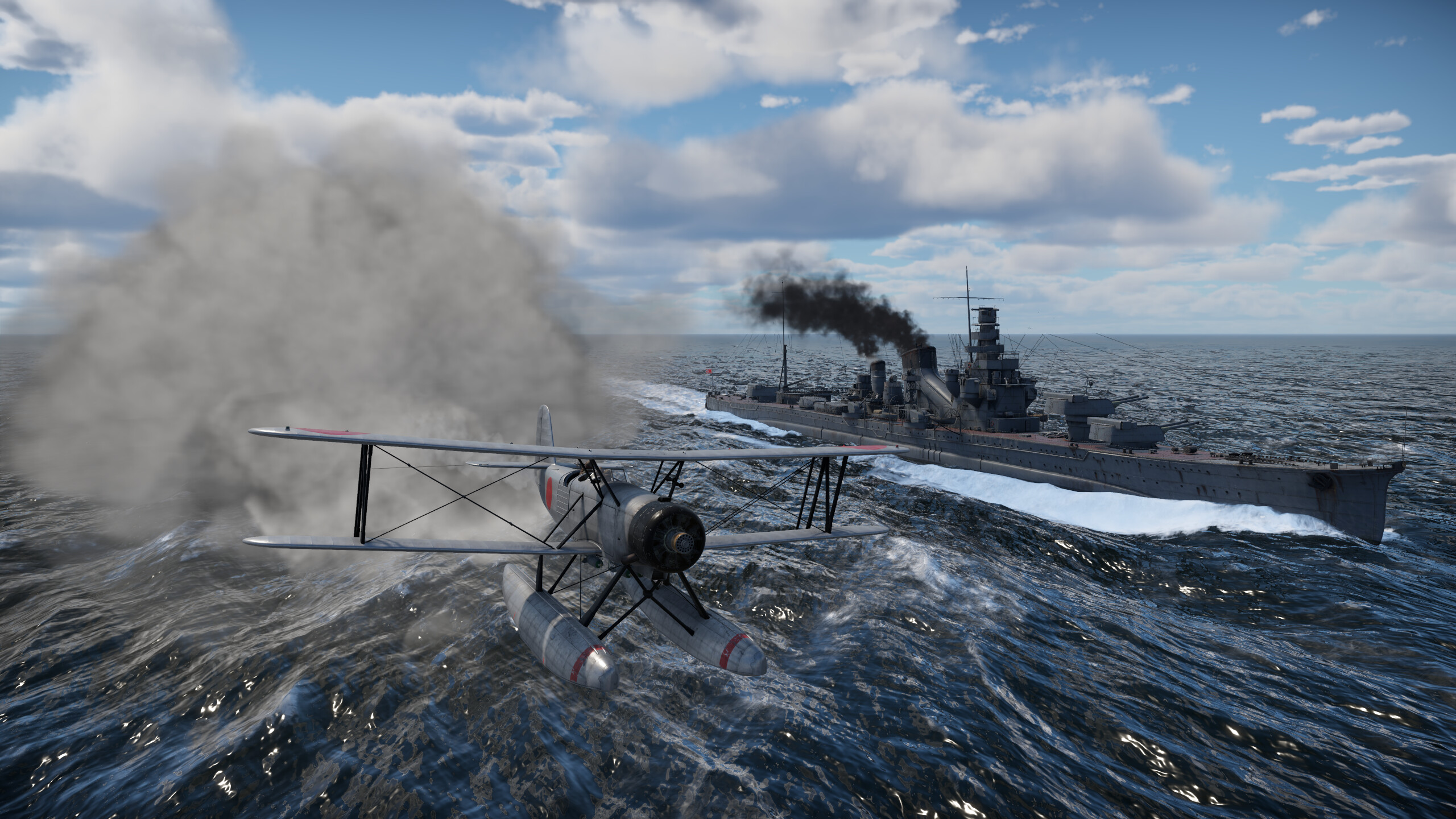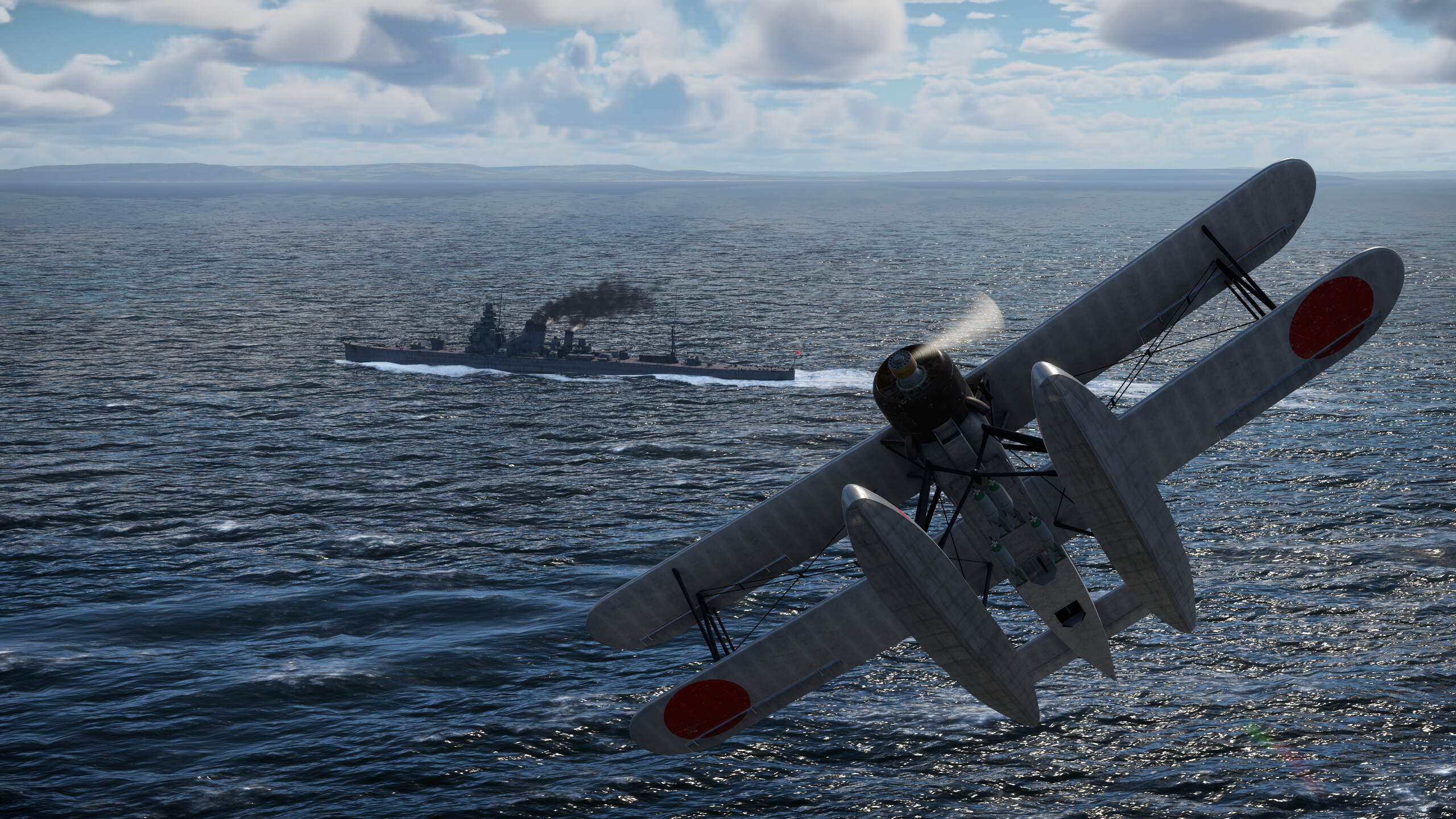 The cruiser is equipped with a very good E7K2 reconnaissance aircraft. The aircraft’s flight characteristics are average. It’s easy to take off from the water and avoid incoming fire. Its main armament consists of 60 kg Type 97 No. 6 high-explosive bombs and a twin 7.7 mm defensive machine gun.