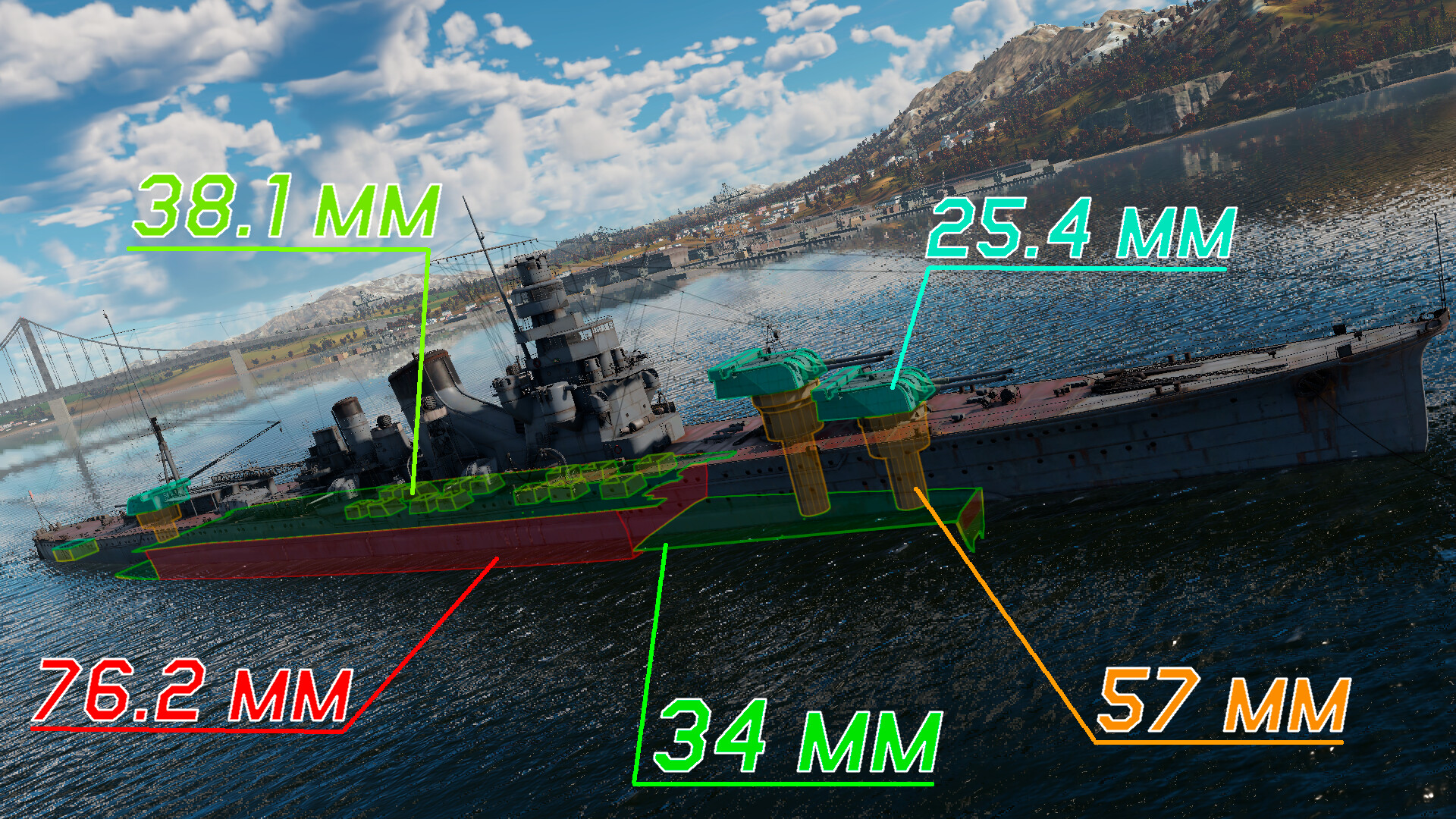 The cruiser’s 76.2 mm thick main belt covers the boiler rooms from the sides, which is protected above by a deck of thickness from 31.75 mm to 35 mm, and the stern and bow are enclosed by 76.2 mm thick armored bulkheads. Also on the sides, above the armor deck, are the coal bunkers, which give minor protection equivalent to 10 mm of armor. The main battery magazines are not protected from the sides, but they are below the waterline and also protected from the front by a transverse of thickness from 38 to 63.5 mm, as well as covered from above by a 34 mm thick armored deck. There is no protection of the bridge.