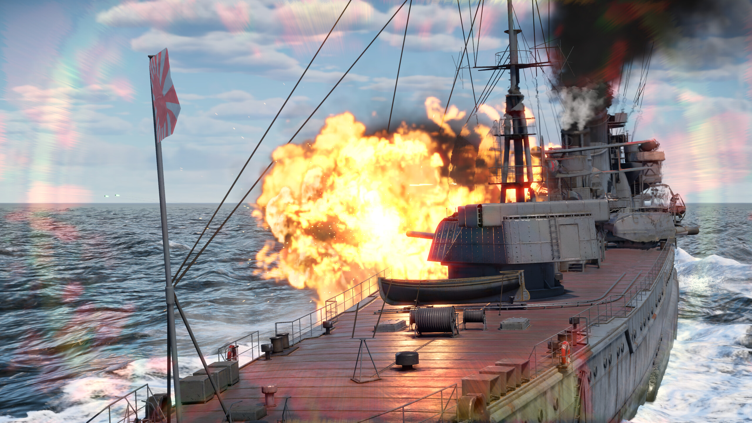 The main caliber is represented by three Type E2 gun mounts with dual 203 mm Type 3 No. 2 guns. The guns have excellent accuracy and rate of fire — one shot every 12 seconds with an ace-level crew.