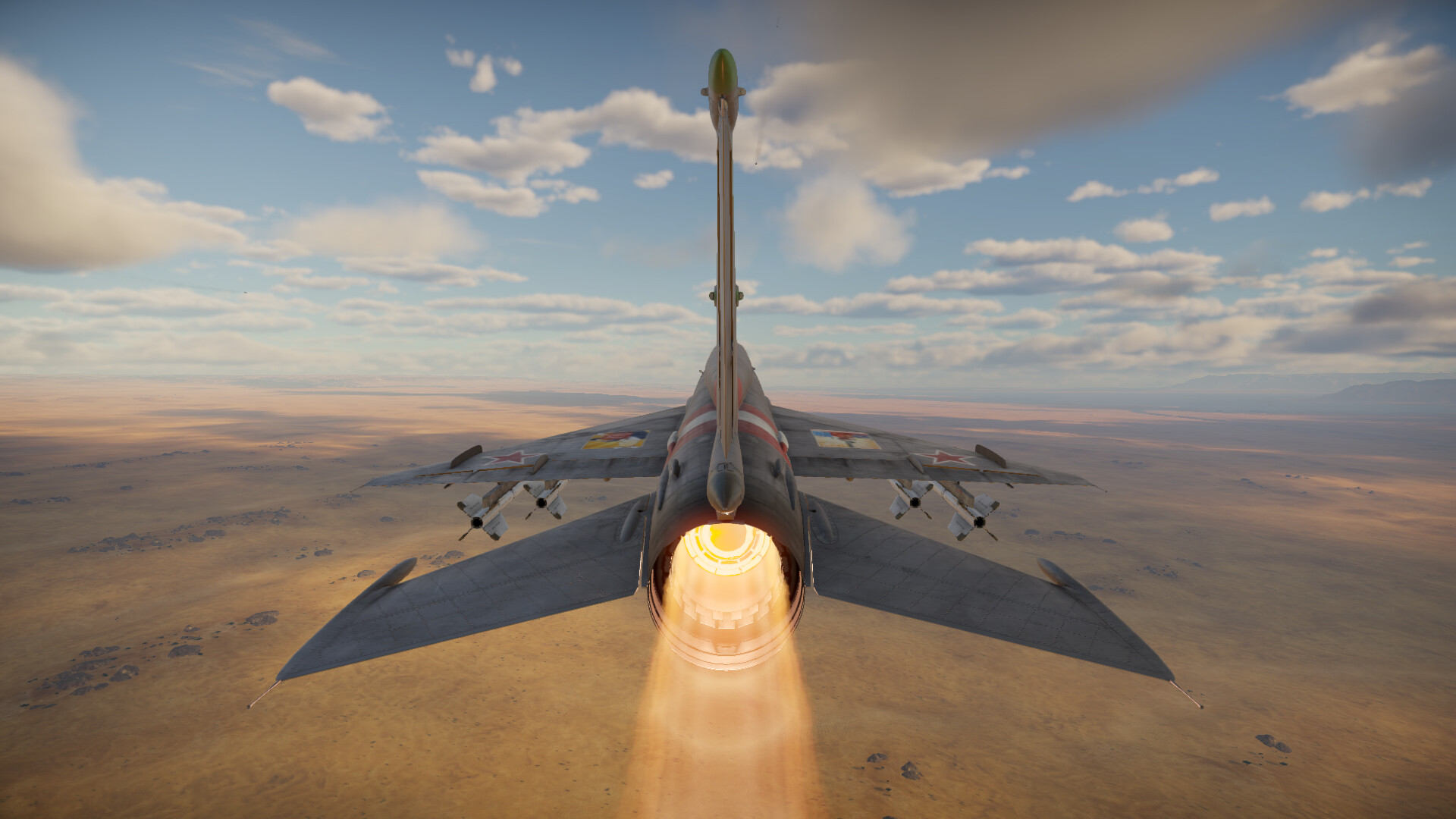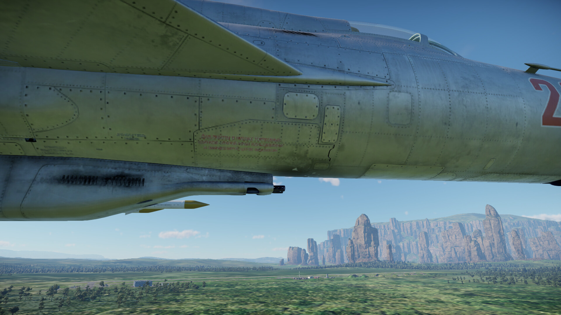 The centre of the plane (or pretty much the entire plane) is the Tumansky R-13-300 engine, with a maximum thrust of 6977 kgf in full afterburner under optimal conditions. Considering the aircraft is very light, this gives it an incredible rate of acceleration, given its weight, reaching Mach 1 in a short timespan. Despite the engine power, you do not get supersonic cruising, with your max speed not in afterburner sitting at around Mach 0.85. Compared to other supersonic jets you might find, like the F-100, you have a much better engine.