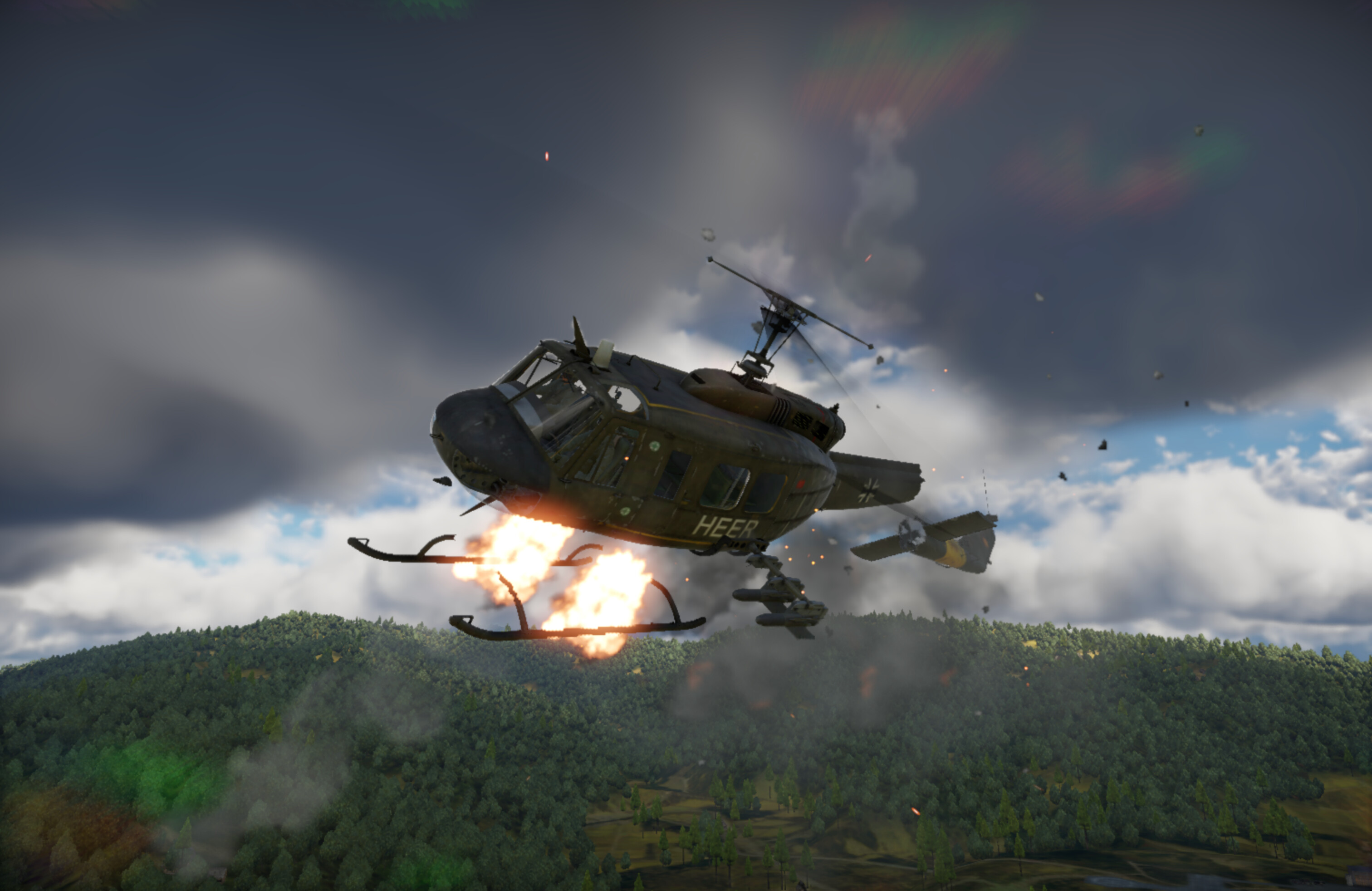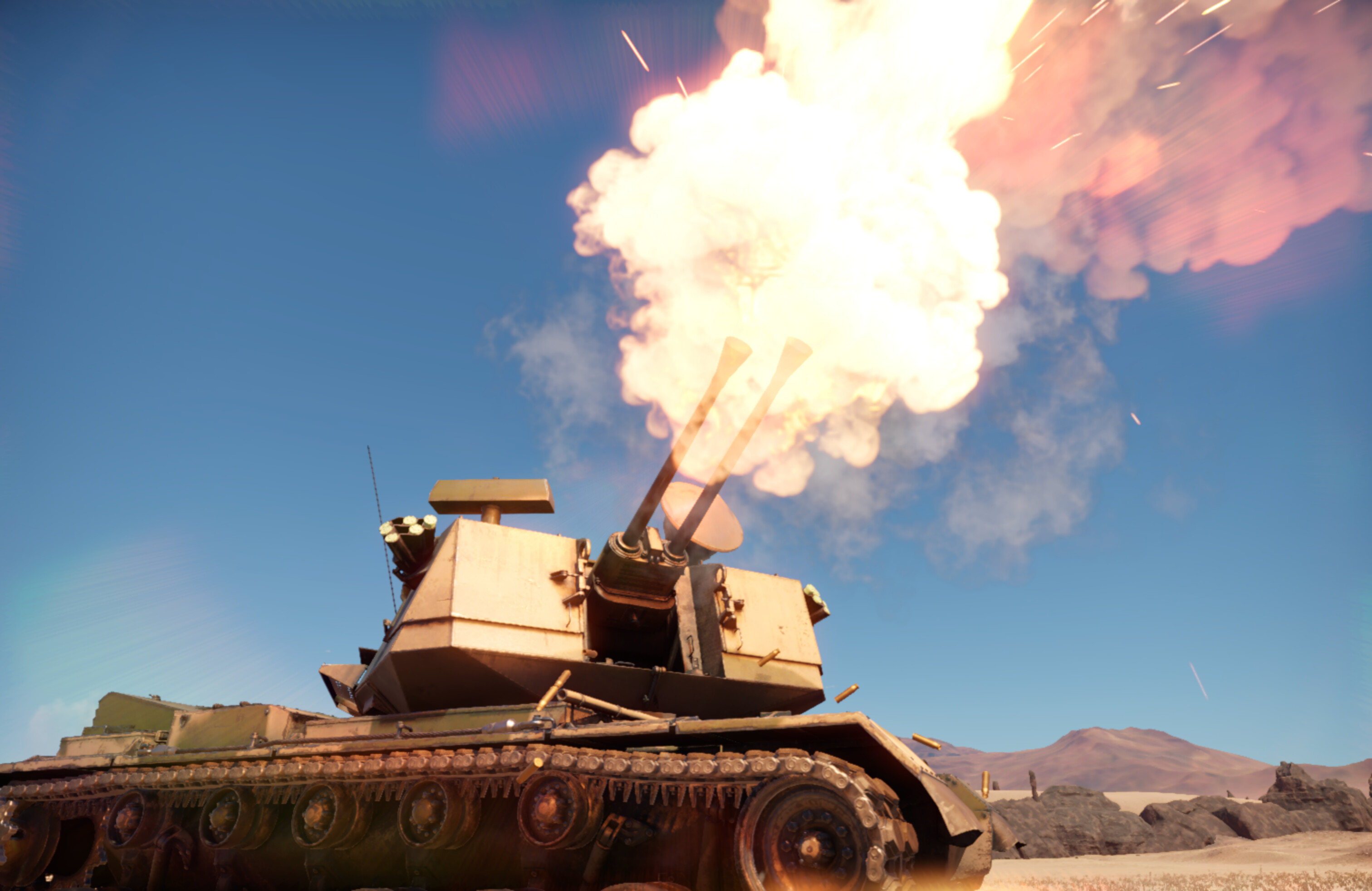 While the fire control system provides a lead point for the guns, you shouldn't trust it too much. It calculates the lead as if the plane is flying at a constant speed and direction, which is rarely the case in reality, so you will need to compensate for these changes. If the lead is growing, the enemy is accelerating and hence you need to lead it a bit more, and vice versa if the lead is shrinking. If the enemy is turning, aim slightly ahead of the turn. With practice, the M247 can shoot down any aircraft within 3 km regardless of how violently they are manoeuvring. Additionally, when firing at helicopters hovering close to the HE-VT's maximum range, you can wriggle your aim to scatter the shots around the enemy to ensure a better probability of kill.