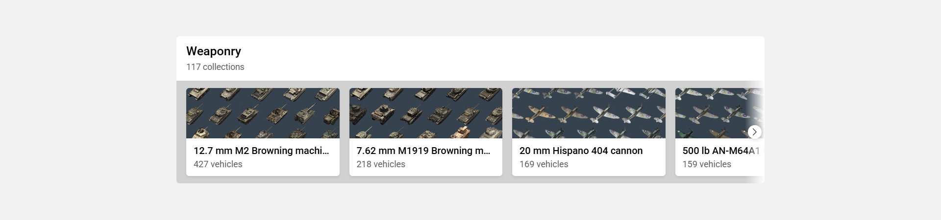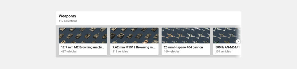 It is now very easy to find vehicles with the same weaponry. If the weaponry is integrated into the new system, go to its collection page by clicking the link on the vehicle card or find it in the list of all collections.