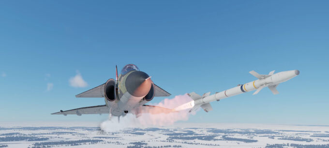 For gameplay in air battles or CAP duty, the Viggen has some useful features and limitations. Like previously mentioned, the aircraft has a powerful engine, the Volvo RM8. This can be used to outrun enemies that are on your tail, and the speed is always helpful for launching your missiles farther. On the topic of missiles, 2 RB24J can be mounted on your aircraft. They are imported AIM-9Ps with subpar range and decent agility. You can slave the seeker to your radar, which can help in certain scenarios. Dog fighting is not recommended because the Viggen has a very large airframe and can be easily hit with guns.