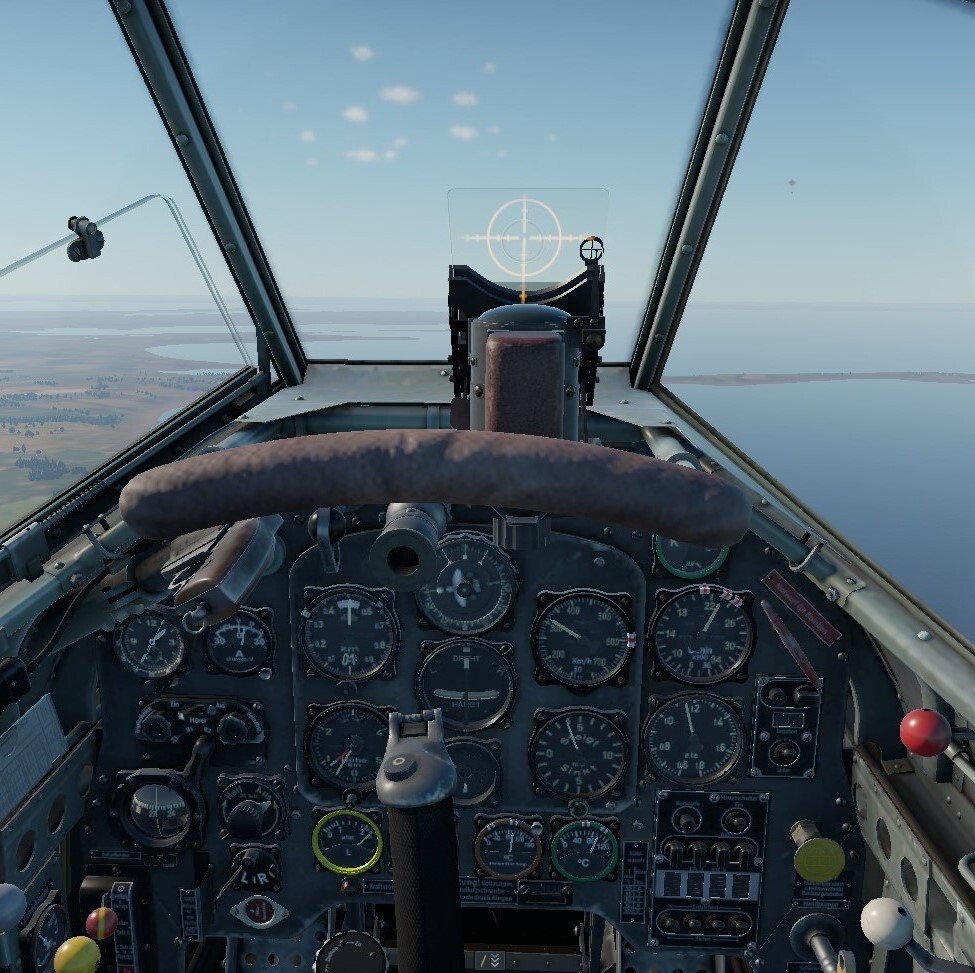 - Leather head-rest: As previously mentioned, it was common for a pilot to black out when entering a dive. The majority of cockpits during the Second World War were made of metal or Bakelite, for durability. Thus, there were lots of various sharp and hard edges, like the rim of the dashboard. If a pilot blacked out during a dive, he would probably slump forward; in doing this in the confined space of a cockpit, he would almost certainly hit his head, possibly causing concussion and serious injury to himself. So, a leather band filled with a soft material, like foam padding, was added just in front of the gun sight to prevent such accidents. Whilst this was by no means a new invention (being used on other aircraft like the Hs 123) it was certainly an important addition to the Stuka’s cockpit.
