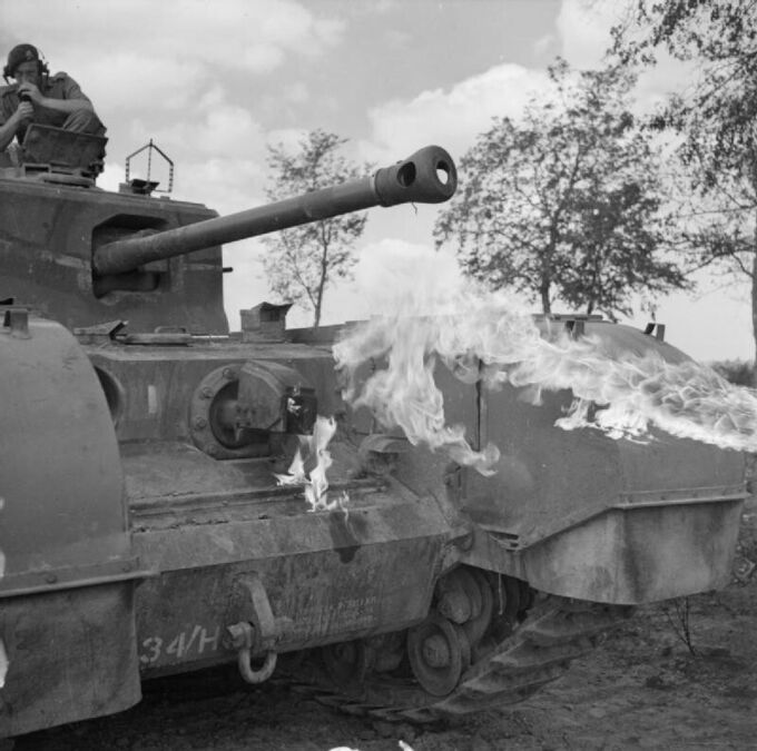 The thick armour, large size, and flame projector made it ideal for assisting Allied troops fighting through the dense French bocage which caused many units trouble. It was also specially noted for its aptitude at clearing entrenched enemy positions, something that it would excel in during the war as a whole. When attacking reinforced fortifications such as bunker networks, Crocodiles would act in concert with Churchill AVREs. The AVRE’s massive bomb would open cracks in the concrete positions, allowing the burning liquid from the Crocodiles' flame projectors to seep inside and flush out the enemy.