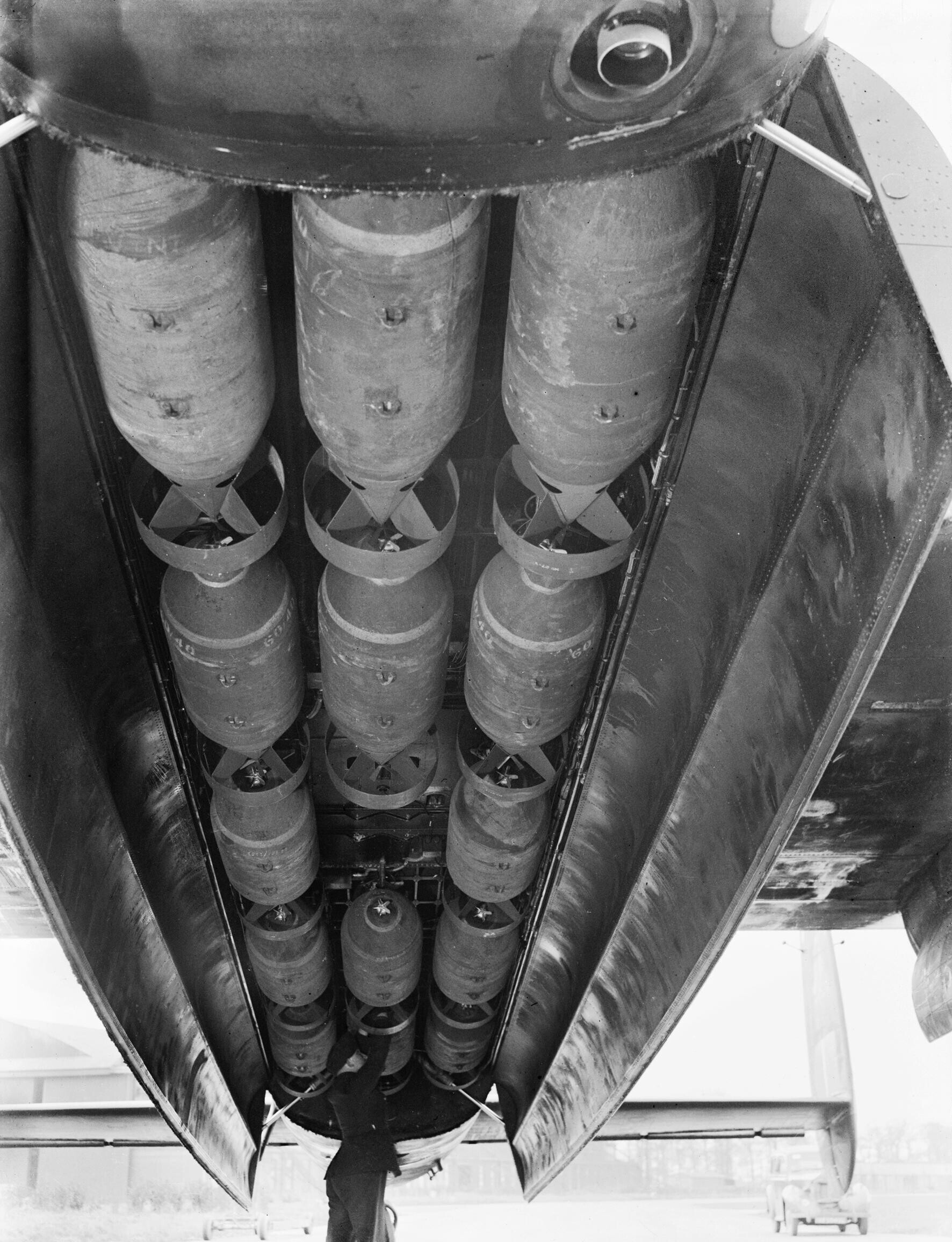 The Lancaster’s primary role was to carry tonnes of bombs long distances and to drop them on enemy targets. It carried out this role exceptionally, thanks to its massive and unobstructed bomb bay. This allowed it to carry a huge range of different ordnance without modification. Each different bomb load had a codename and was used for a different target. “Usual” for example was used for area bombing and consisted of 2,832 4-lb incendiaries and a 4,000lb “Cookie” blockbuster bomb. “Abnormal” comprised nine 1,000lb bombs and was used to destroy industrial targets. “No-ball” was intended to knock out V-1 flying bomb launch stations.