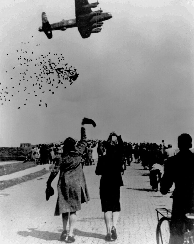 A Lancaster releasing its payload of food supplies over Holland in the dying days of the war in Europe.