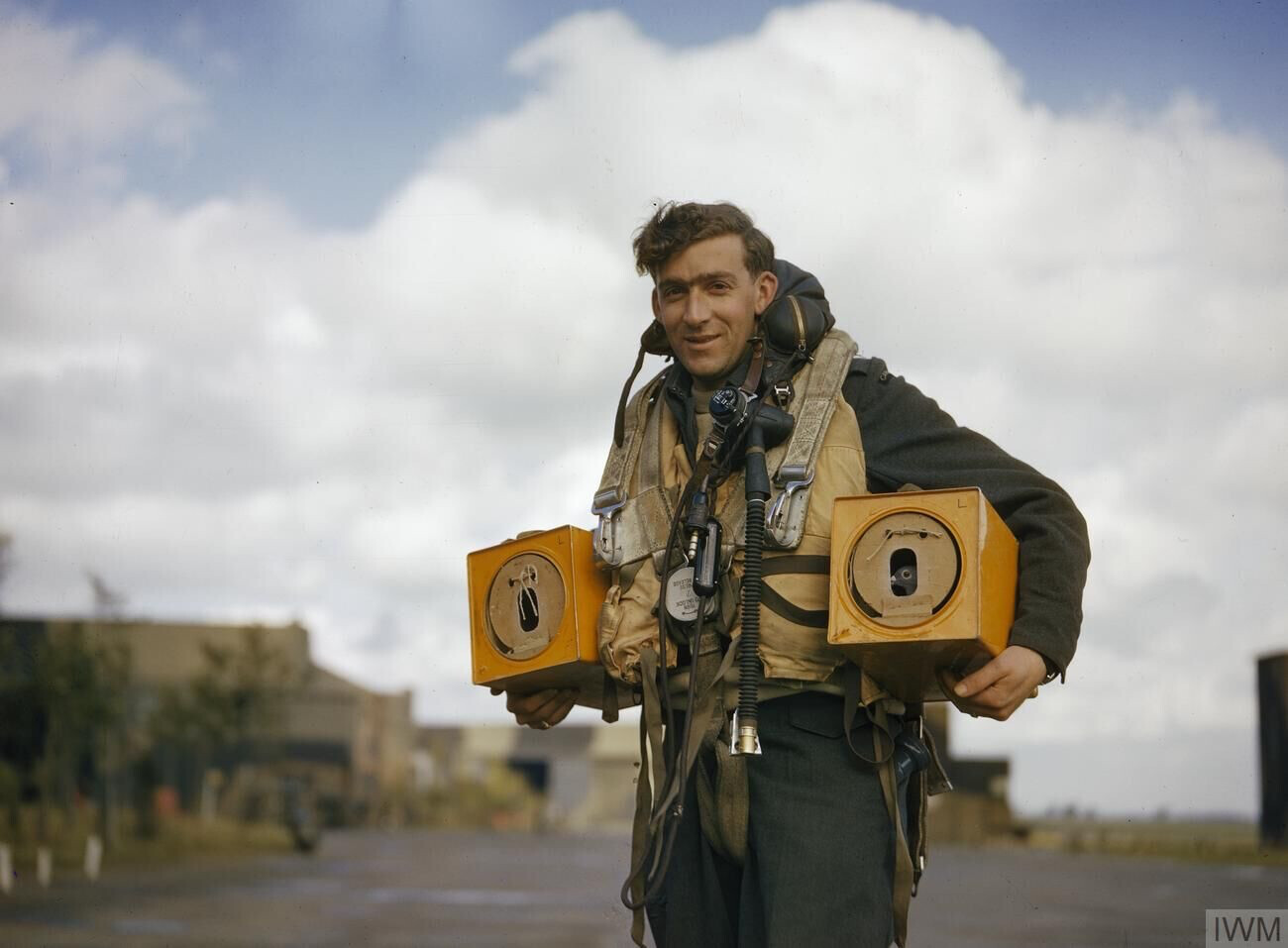 An RAF radio operator carrying a pair of homing pigeons, which were to be used in case of radio failure or crash landing. [Source]
