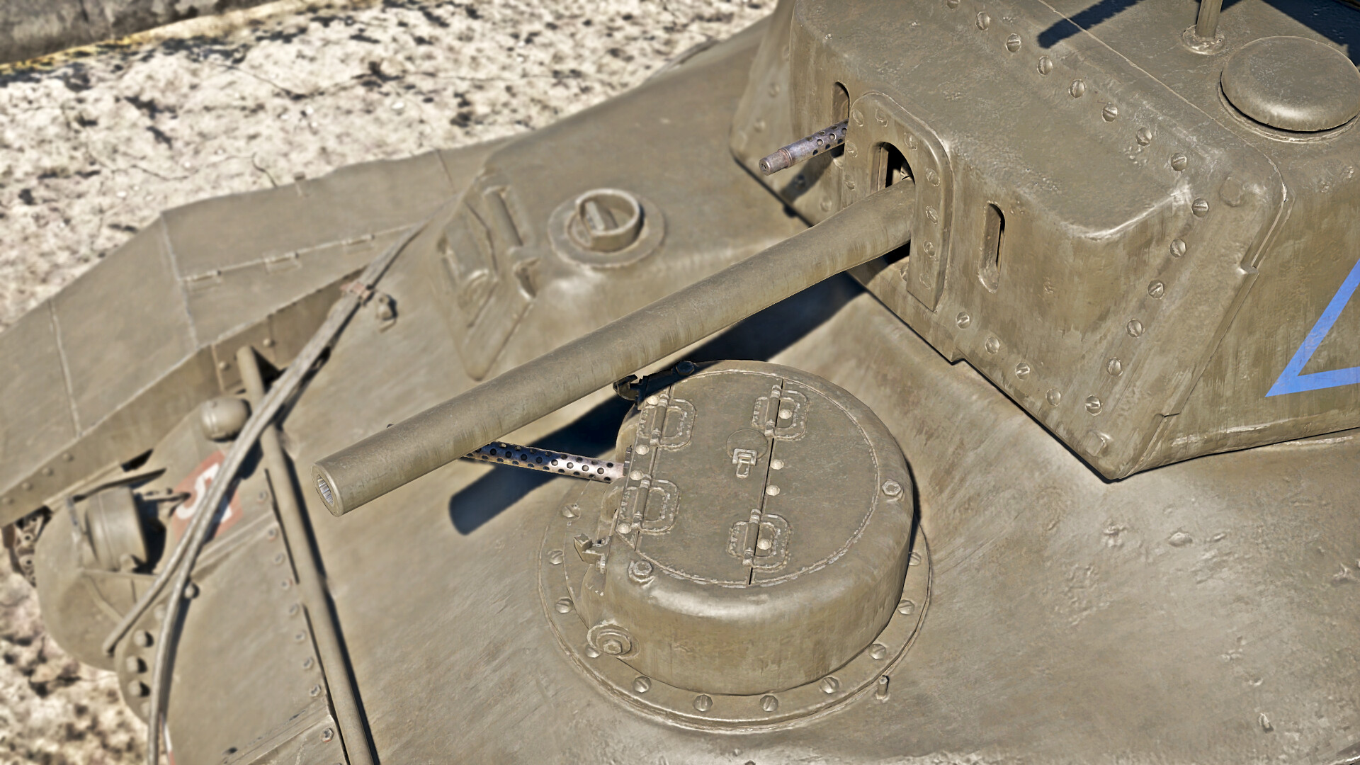 The M4A5 is equipped with a short 6-pounder, or 57 millimetre cannon which is able to carry up to 92 rounds and has a 4 second reload rate when your crew is fully Aced. This, along with a good turret traverse rate of up to 20° per second, allows you to quickly respond to oncoming threats and makes urban combat effective. The gun has a suitable -7 degrees of gun depression, which allows the tank to peek over some hills, and is also fitted with a vertical stabiliser, which makes the cannon shake less when moving and pairs well with the tank’s mediocre speed and acceleration rate, allowing for well-aimed shots on the move. The M4A5 is also armed with 2 non-coaxial machine guns (one on the hull and one on top of the turret) and a coaxial machine gun, which allow the tank to deal with light vehicles effectively.