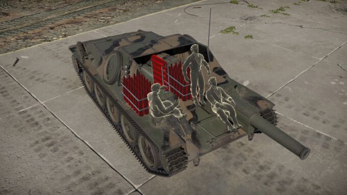 Of course, the most important feature of this tank destroyer is the 120mm Automatkanon, capable of firing an APCBC or HE round every 1.2 seconds. The muzzle velocity of the cannon isn’t very good, at only 525 m/s, making the rounds drop quite a bit once they leave the barrel. This also means the penetration of the APCBC isn’t very good, only 95mm of penetration at point blank. This is enough to penetrate most medium tanks from the front, and any tank, at its BR, from the side. Penetrating is the only hard part though, since the APCBC holds 890g of explosive mass, it tends to obliterate tanks with a single hit. Besides, if you miss or don't finish the enemy off with the first round, you can simply send a quick follow up shot to finish the job.