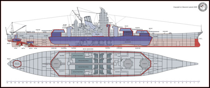 - Armor protection effective against 46 cm shells at distances between 20 - 35 km