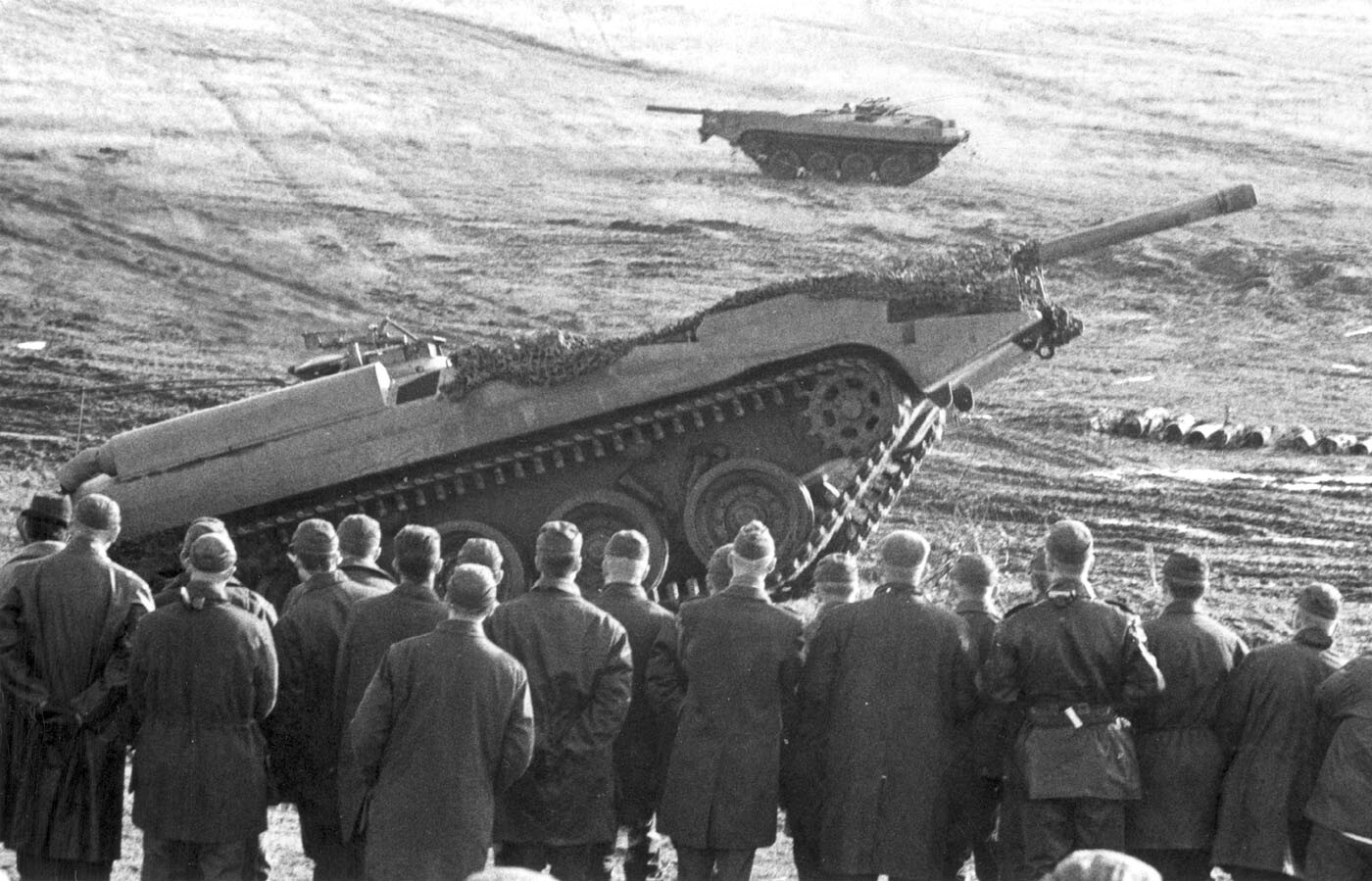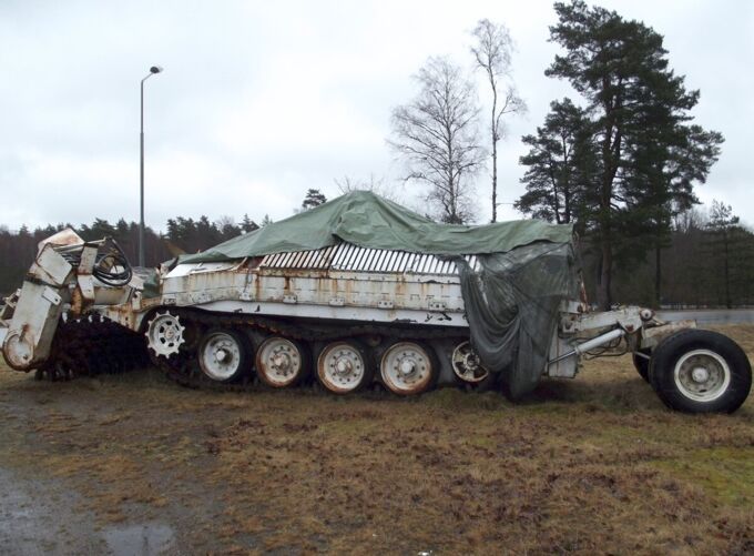 The Strv 103 was best used in a hull-down position, where the gun could simply peek over a small hill, making it nearly impossible to penetrate its sloped armor. At least one tank in each platoon was equipped with a bulldozer blade for digging hills for this purpose. The blade also doubled as extra protection for the lower front plate.