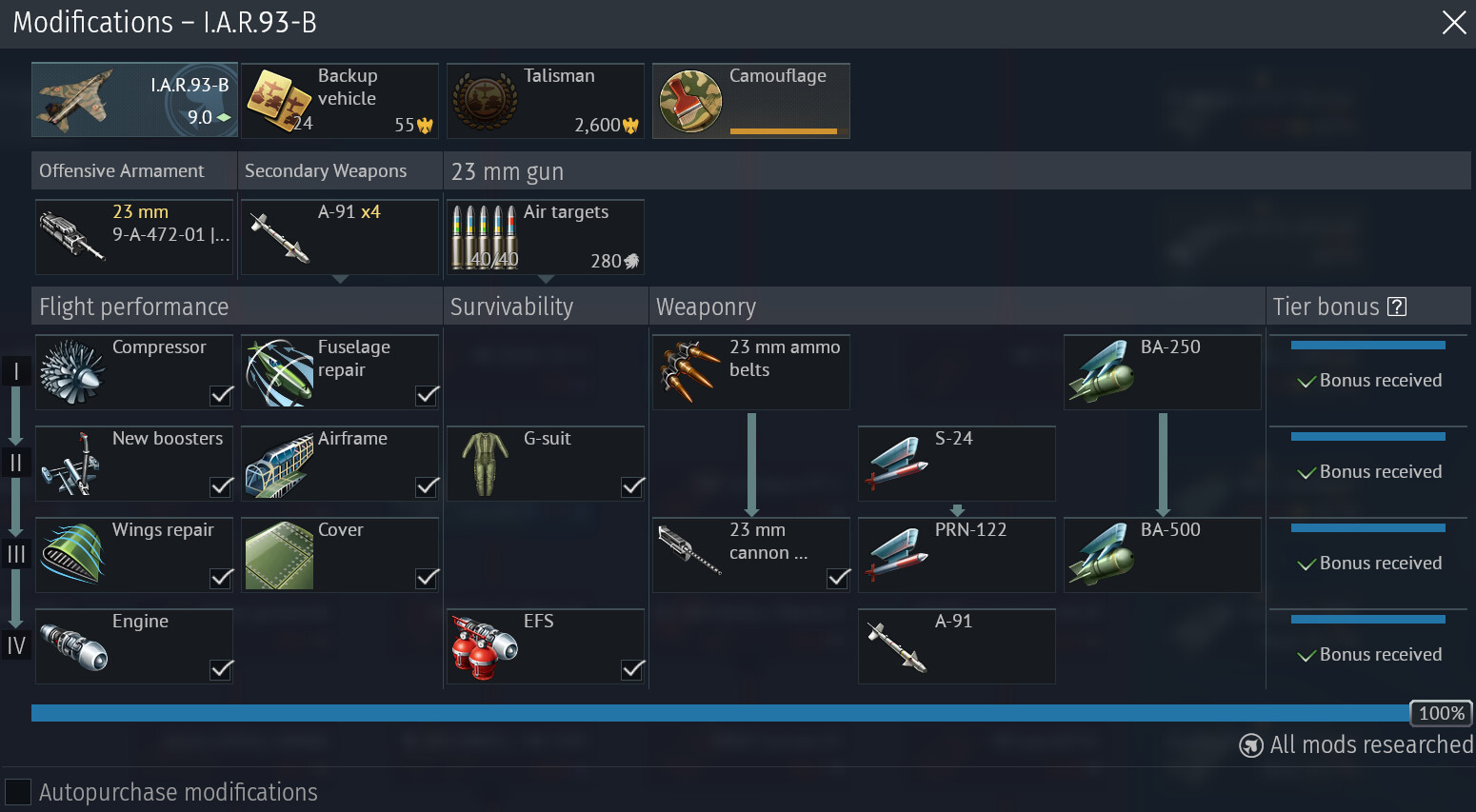 The number one thing you want to do when modifying this plane is to rush all of the flight performance upgrades. The IAR-93's engines are underpowered even when spaded, and when stock, it is very rough. The engine modification is the most important flight performance modification, but getting the A-91 is more important. Because the A-91 is not connected to anything in the modification tree, you can and should rush all the flight performance modifications through rank three, research the A-91 as the first rank four modification, then research the engine modification. Once you have those, get the G-suit modification, then get the gun belts and gun accuracy modifications. After that, you can do the remaining modifications (EFS and the strike weapons) in any order you want.