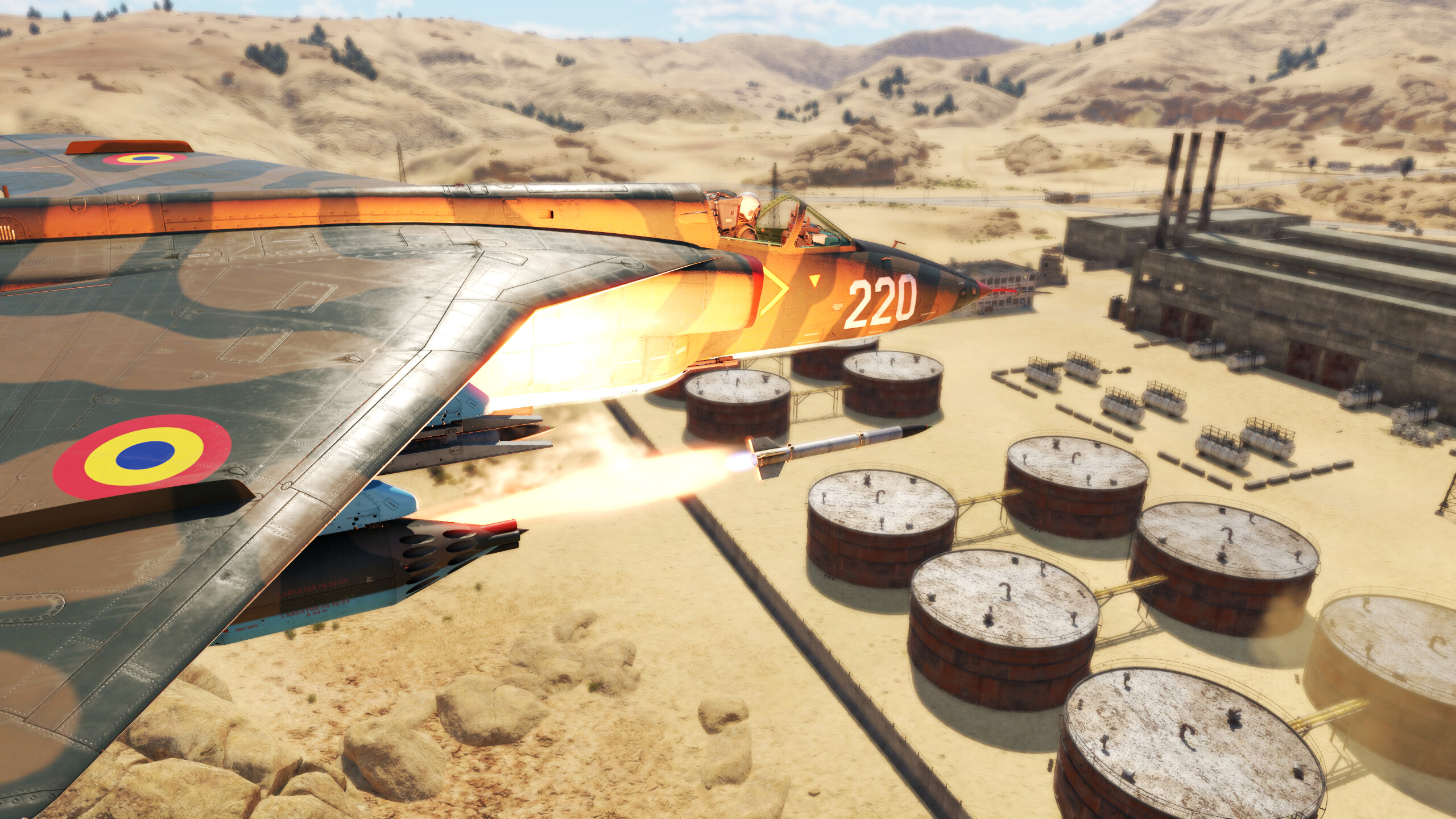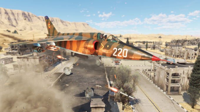 The IAR-93 has CCIP which is very helpful when aiming the bombs and especially the rockets. The S-24Bs are a bit of a balancing act because if you fire from too far, they disperse too much or the target could move too far, but if you fire from too close, you cannot lead the target enough and the S-24B will just hit to the side of where you are aiming. About 1 km is the ideal distance to fire them.