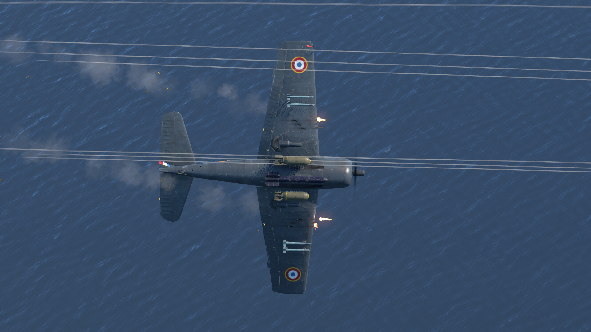 Suspended armament is also really good on these aircraft, consisting of a variety of rockets, bombs and a torpedo. This aircraft gets the typical 500 lb, 1000 lb, and even a 2000 lb bomb which are all perfectly capable of destroying any tank. You also get HVAR and Tiny Tim rockets which are both capable of destroying open-tops with a close hit and some light tanks with a direct hit. However the Tiny Tims are preferred because of their high explosive filler making them capable to destroy tanks even with close hits. But be careful, as these will damage you if you don’t pull up in time.