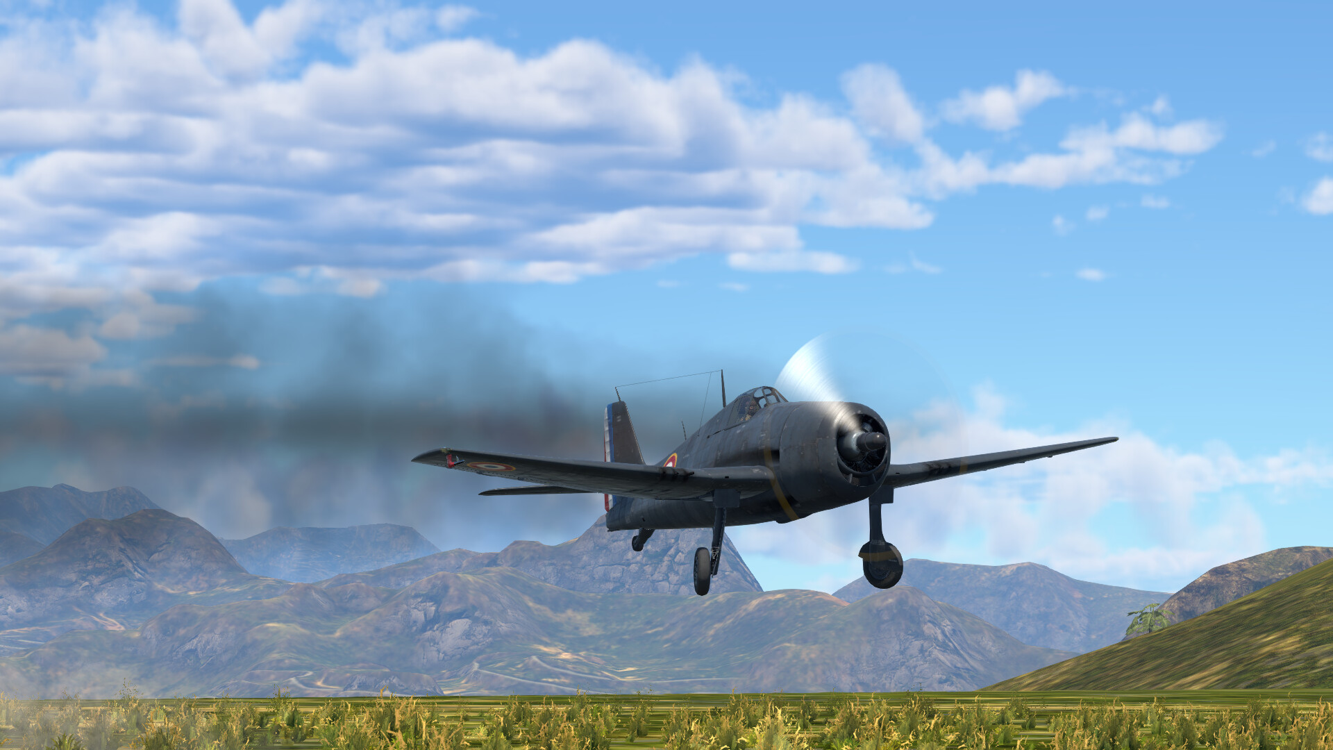 French F6F-5 landing with a damaged engine