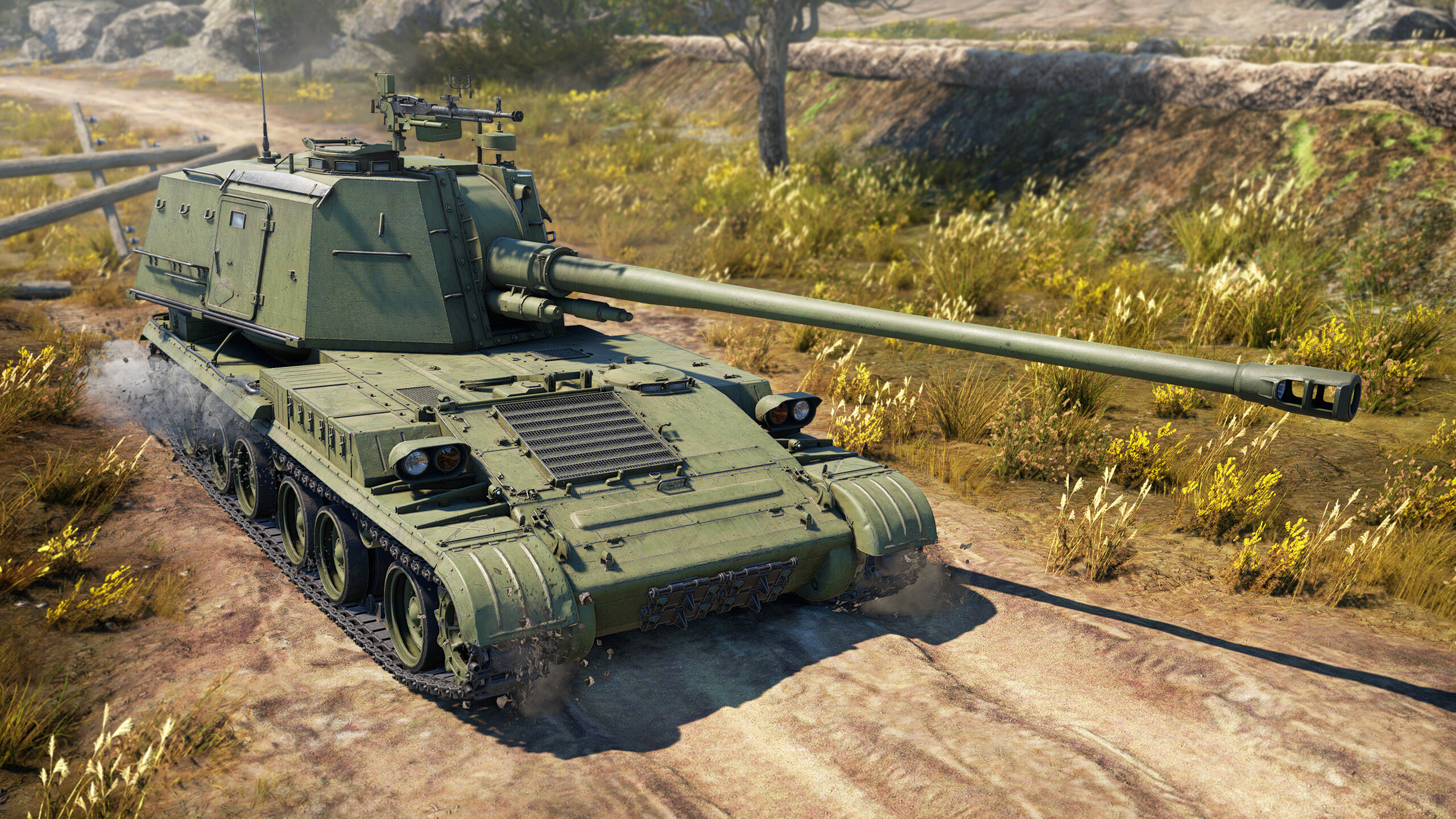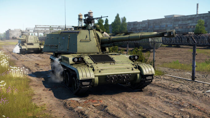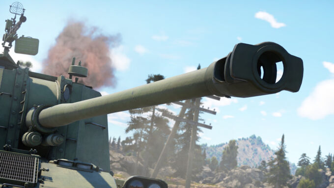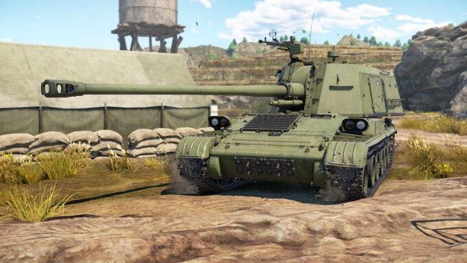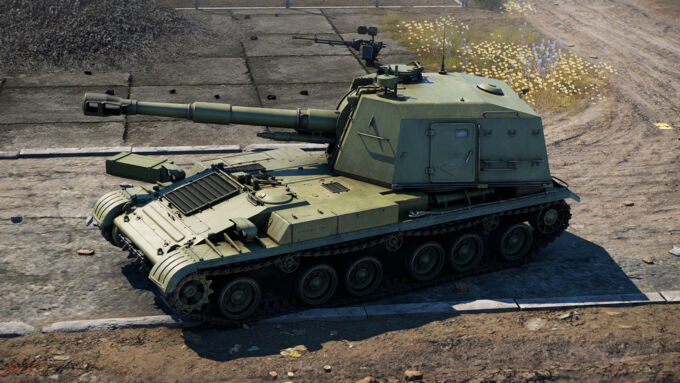 The reverse speed is significantly lower than that of its counterparts, reaching only 9 km/h, which may be insufficient for quickly retreating from enemy fire or playing from cover, especially considering the rear-mounted gun. The wide tracks and high power-to-weight ratio are also noteworthy, allowing the self-propelled gun to traverse rough terrain and shallow water bodies without major difficulties. However, navigating hilly terrain without sufficient momentum will reduce its speed to 17-25 km/h.