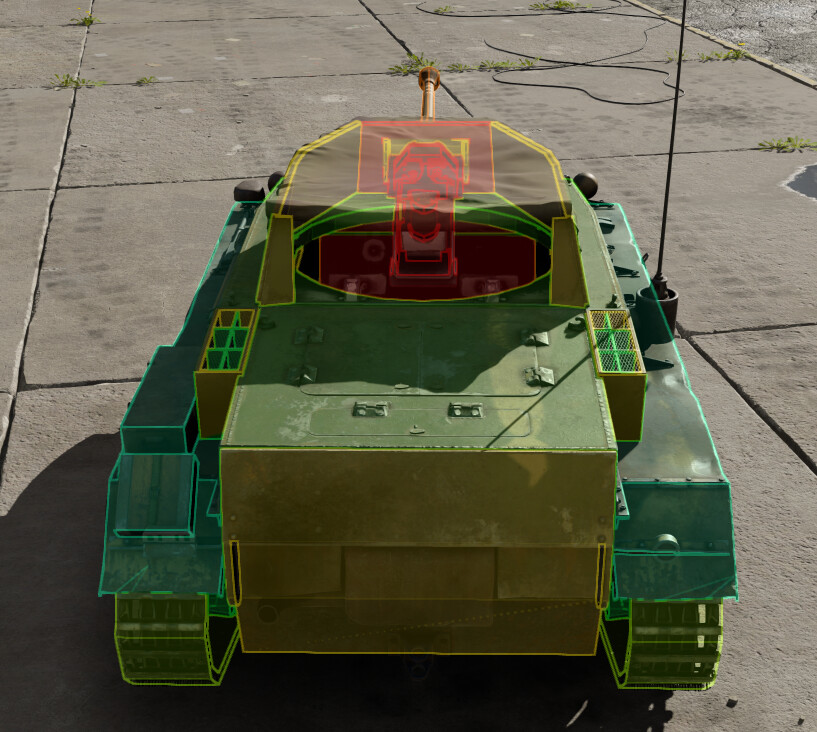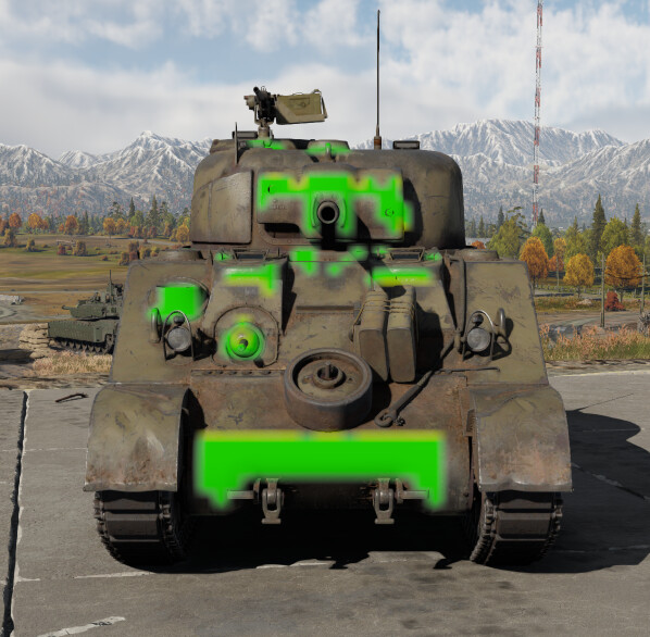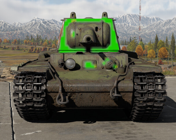 The KV-1(L-11), with areas which the Pz.Sfl.Ic is capable of penetrating with its PzGr 39 shell highlighted in green. The pennable areas for the Pz.Sfl.Ic’s APCR shells are much the same.
