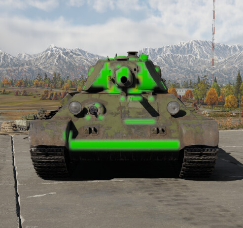 The T-34 (1940)'s frontal profile, with vulnerable areas to the PzGr 39 highlighted. Note the green stripe on the bottom of the upper frontal plate.