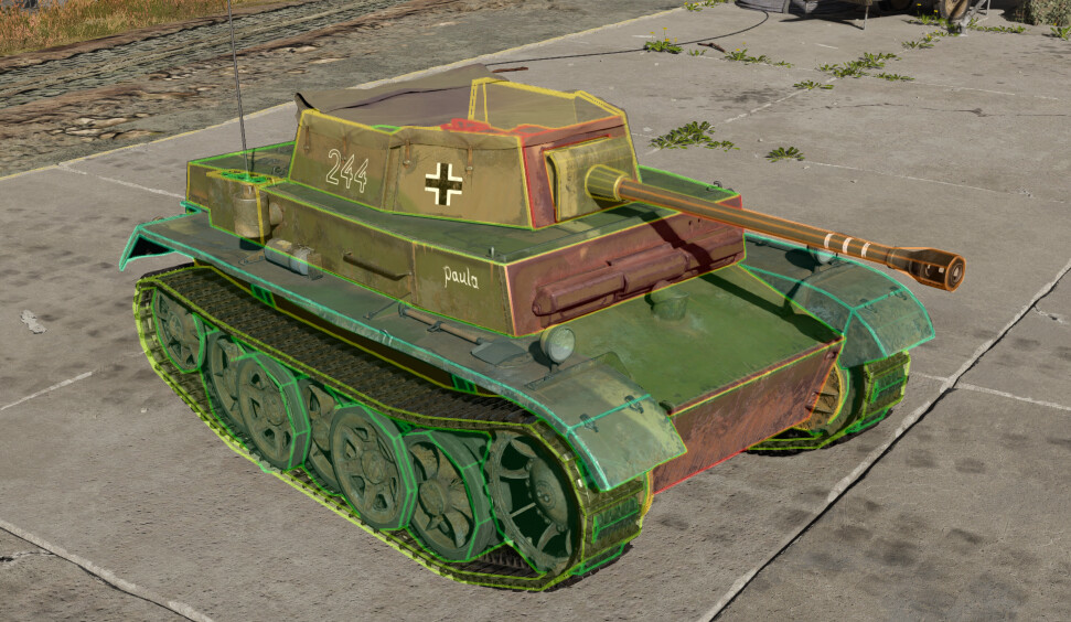 The Pz.Sfl.Ic’s armor protection is generally average for light tanks at low battle ratings, meaning it is generally sufficient for stopping high-caliber machine gun rounds but not much else. The tank overall lacks angled plates, resulting in effective armor values not differing significantly from their base thickness. Frontal armor thickness does not exceed 30mm, and the sides as well as rear of the vehicle are protected by a mere 20mm of armor, barely enough to stop high-caliber machine gun rounds at ranges of around 3-400 or so meters. The roof of the hull is only 10mm thick, leaving the tank vulnerable to strafing attacks, but the vehicle has a second, much larger, vulnerability to strafing which is covered below the following picture.
