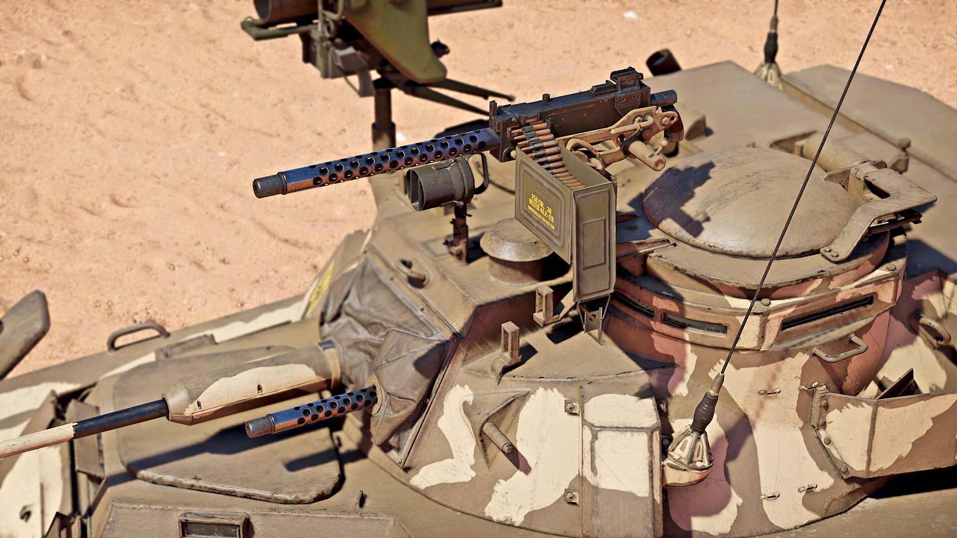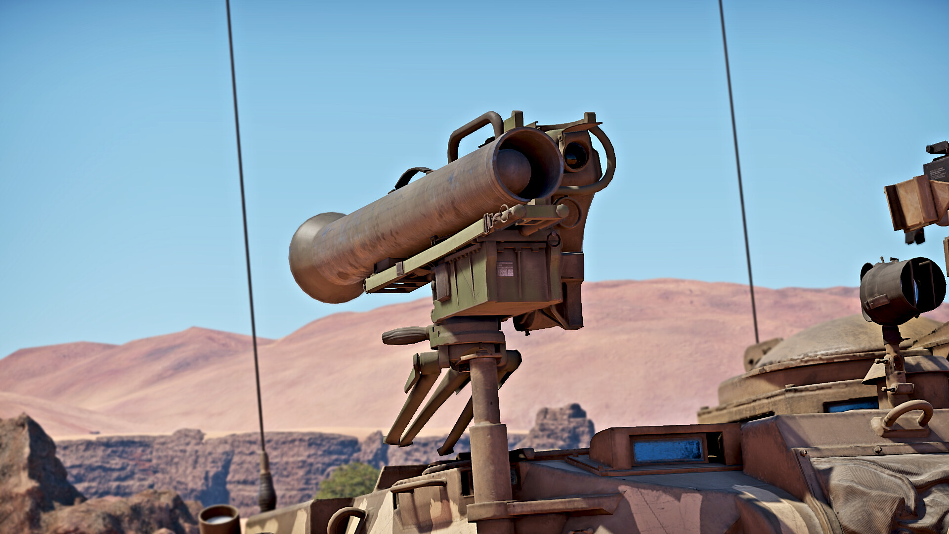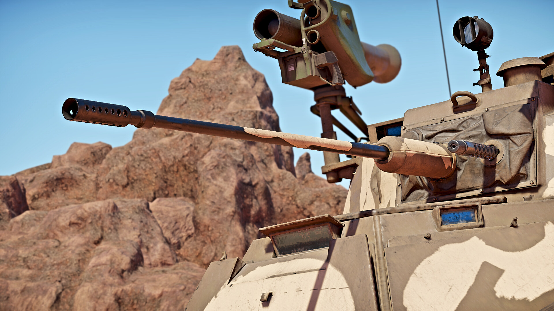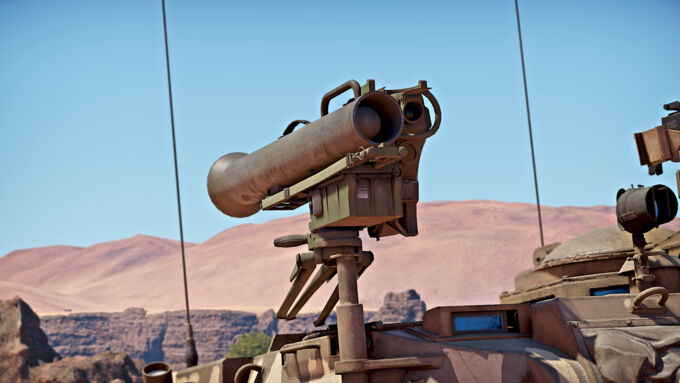The autocannon is broadly similar to the gun found on the Ystervark and Superhind.  It is best suited for shooting at enemy light tanks and low flying aircraft due to its lacklustre penetration but high fire rate. The MILAN is a SACLOS ATGM that is easy to use and will teach the basics of ATGM usage for later progression in the British tech tree. The MILAN missile is slow for an ATGM however, and is best used in circumstances that prevents the enemy dodging your attack or when you cannot use your main gun to get through the front armour in a close quarters engagement. However, the high penetration of the missile makes up for the deficiencies of the autocannon.