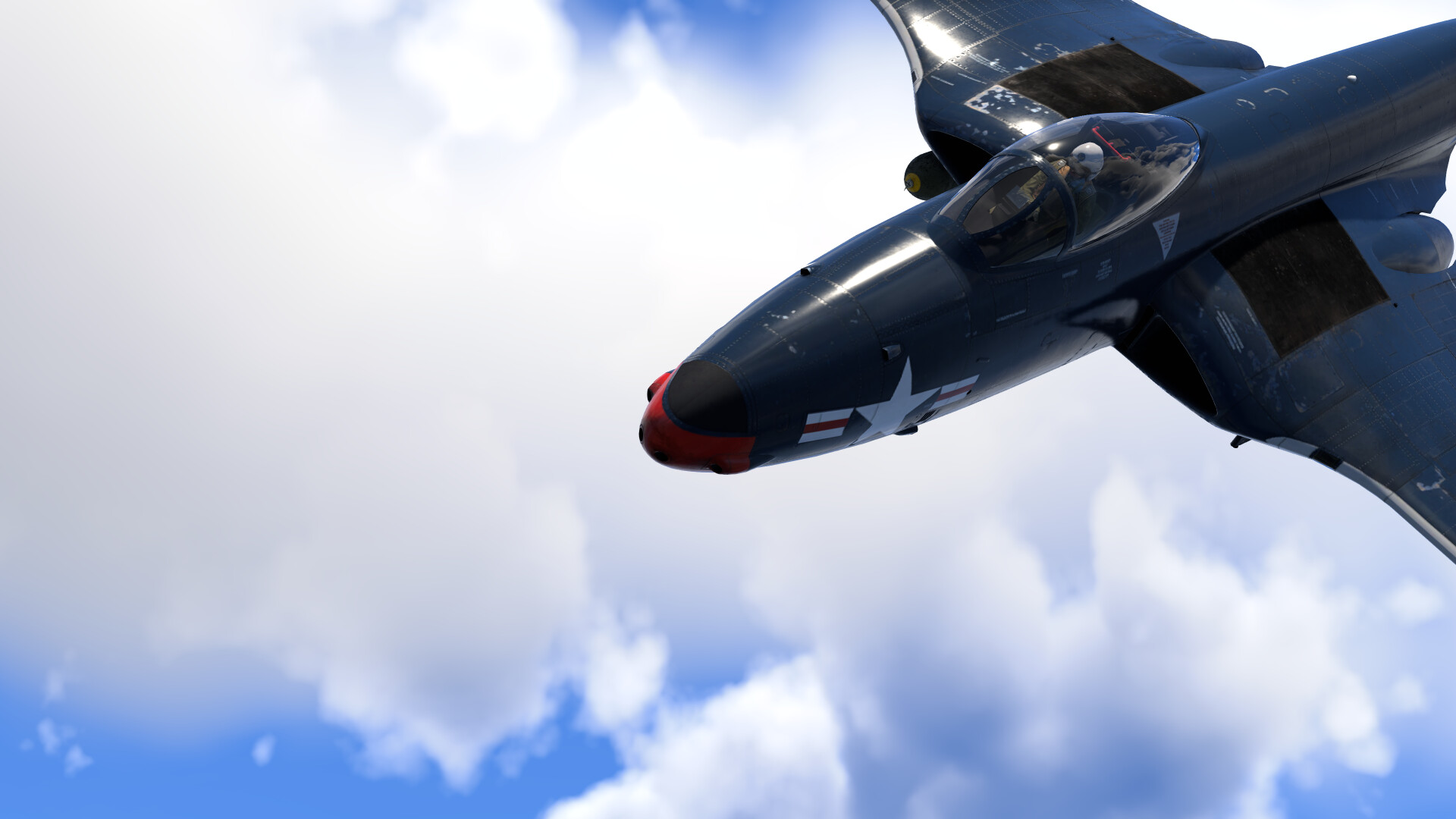 The plane does suffer from high speed compression near 800 km/h IAS (which must be taken into consideration while in a dogfight). Since it is a carrier-based jet, its stall speed is low: varying from 185 to 205 km/h IAS, depending on the weight. The positive and negative G limit for the aircraft are plenty for the average pilot, wing failure happening when turning close to 13G with full realistic controls. The Banshee also has access to airbrakes which can help during landing or in combat situations to slow down the plane.