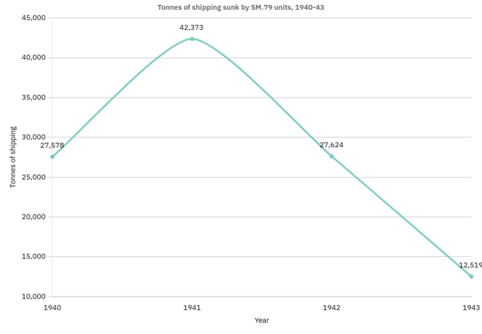 Another notable mission carried out by the National Republican 'Sparvieri' was in June 1944, when a force of 12 modified SM.79s took off from the south of France at night and flew to Gibraltar in a surprise attack. Ten aircraft reached the unprepared British defenders, and three had to force-land in Spain due to running out of fuel, but overall the mission was a success, with the crews claiming 27,216 tonnes of shipping sunk. Similar missions would often be carried out by SM.79 units of the A.N.R., such as the attack on Bari harbor the day after the Gibraltar raid, to varying success. These units also partook in torpedo attacks on Allied shipping in the eastern Mediterranean in July, from bases in Greece. Overall, however, these aircraft suffered immensely at the hands of the Allies, whose fighter aircraft and intense anti-aircraft defenses from ships hampered their efficiency. The last 'kill' of this aircraft during the war would take place in January of 1945, just four months before the end of the war in Europe, when a 5,000-ton ship was sunk by torpedo.