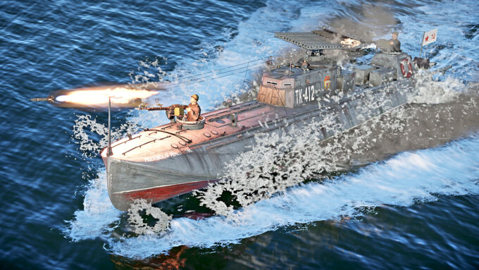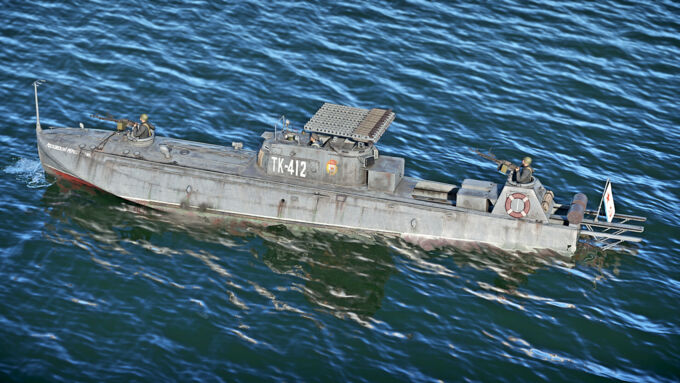 The TKA-412 has a single 82 mm M-8 rocket launcher instead of torpedo armament. It has a single load of 24 rounds (its possible to shoot one rocket at a time) and has a total ammunition load of 48 rockets. While they deal significant damage, the low velocity makes it tricky to hit targets. Initially, you will need to learn how to anticipate the enemy's movements correctly.