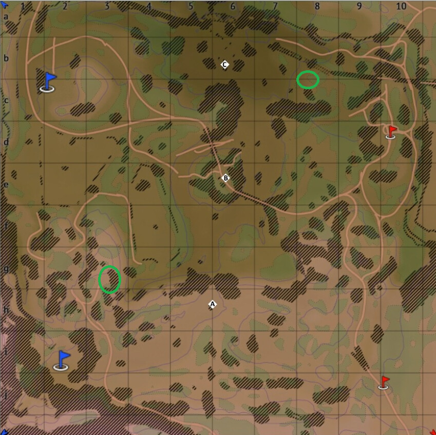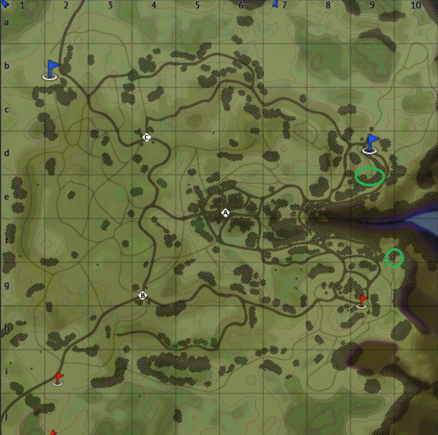 This is an excellent sniping map. From the lower green circle, you have a clear view of point B, the bridge, and its surroundings, allowing you to even target inside the point. Most enemies at this rank are unlikely to notice your position. You can also eliminate anyone attempting to cross the bridge. If you move toward point A, you remain on the edge and can engage enemies, but you become more exposed. On the opposite side of the map, positions are generally less favorable. Point C is located in a depression, allowing you to snipe and defend it from the edge.